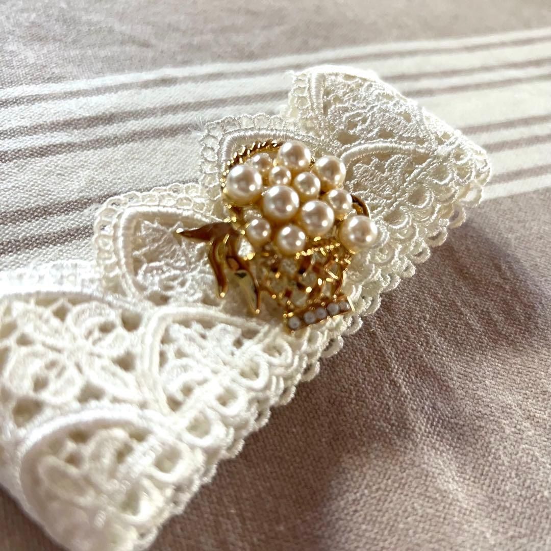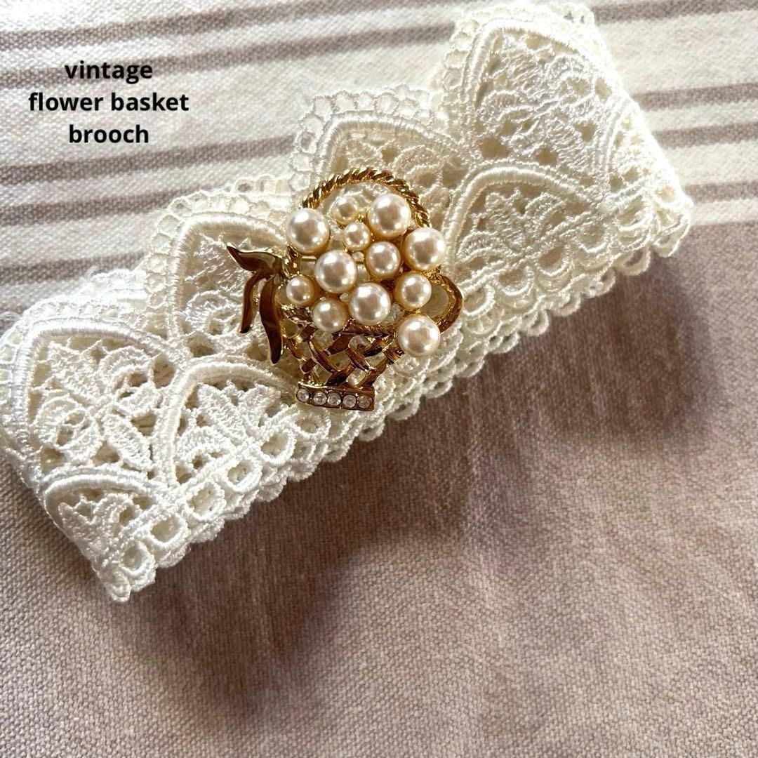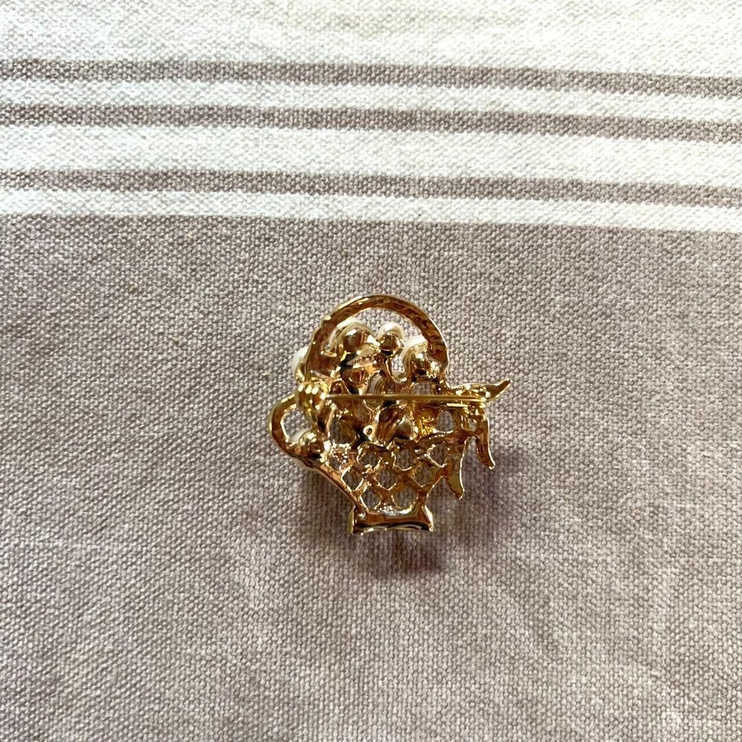 大小のパールがたっぷりとついた花籠デザインのビンテージブローチです。かわいらしいデザインでカジュアルなお洋服にも似合います
