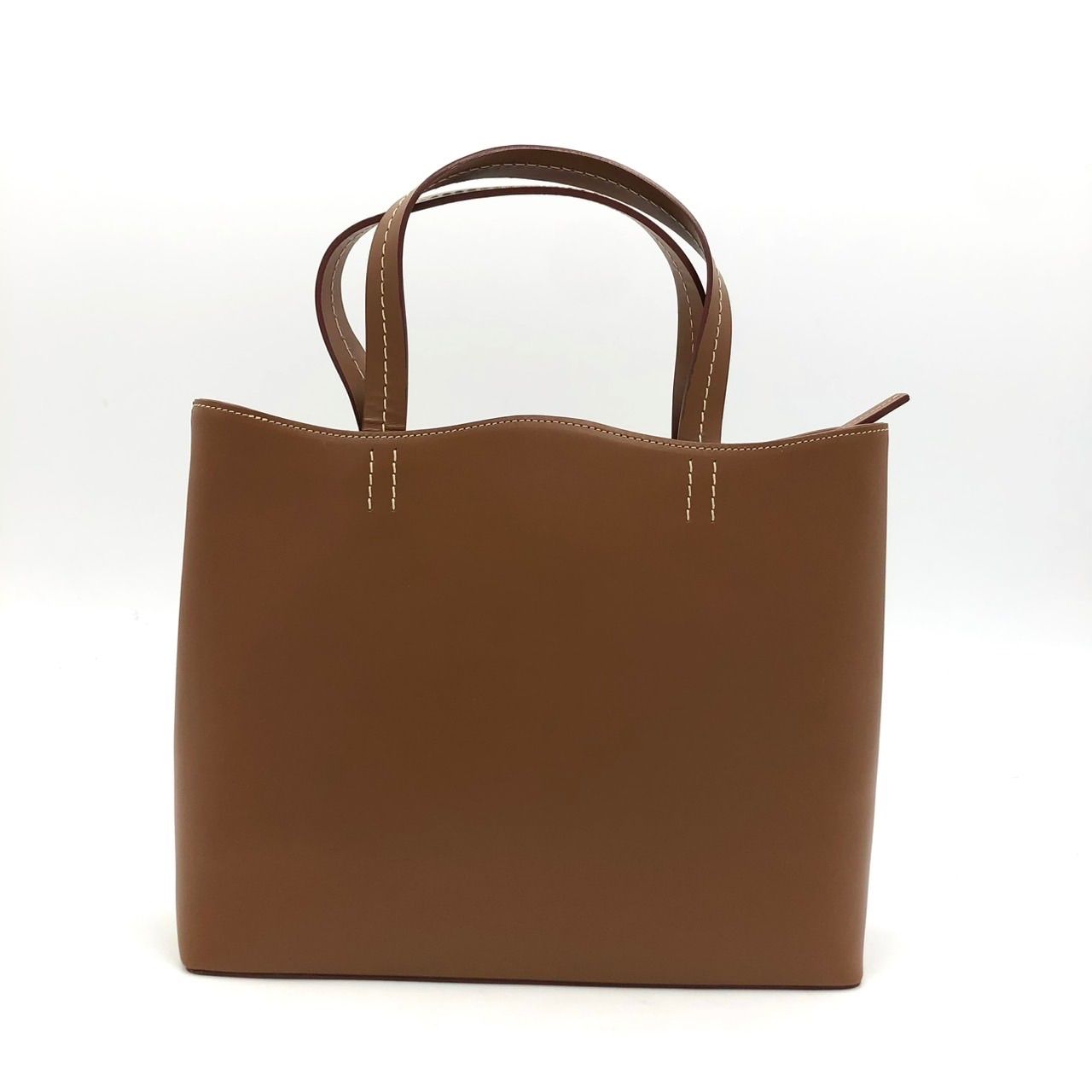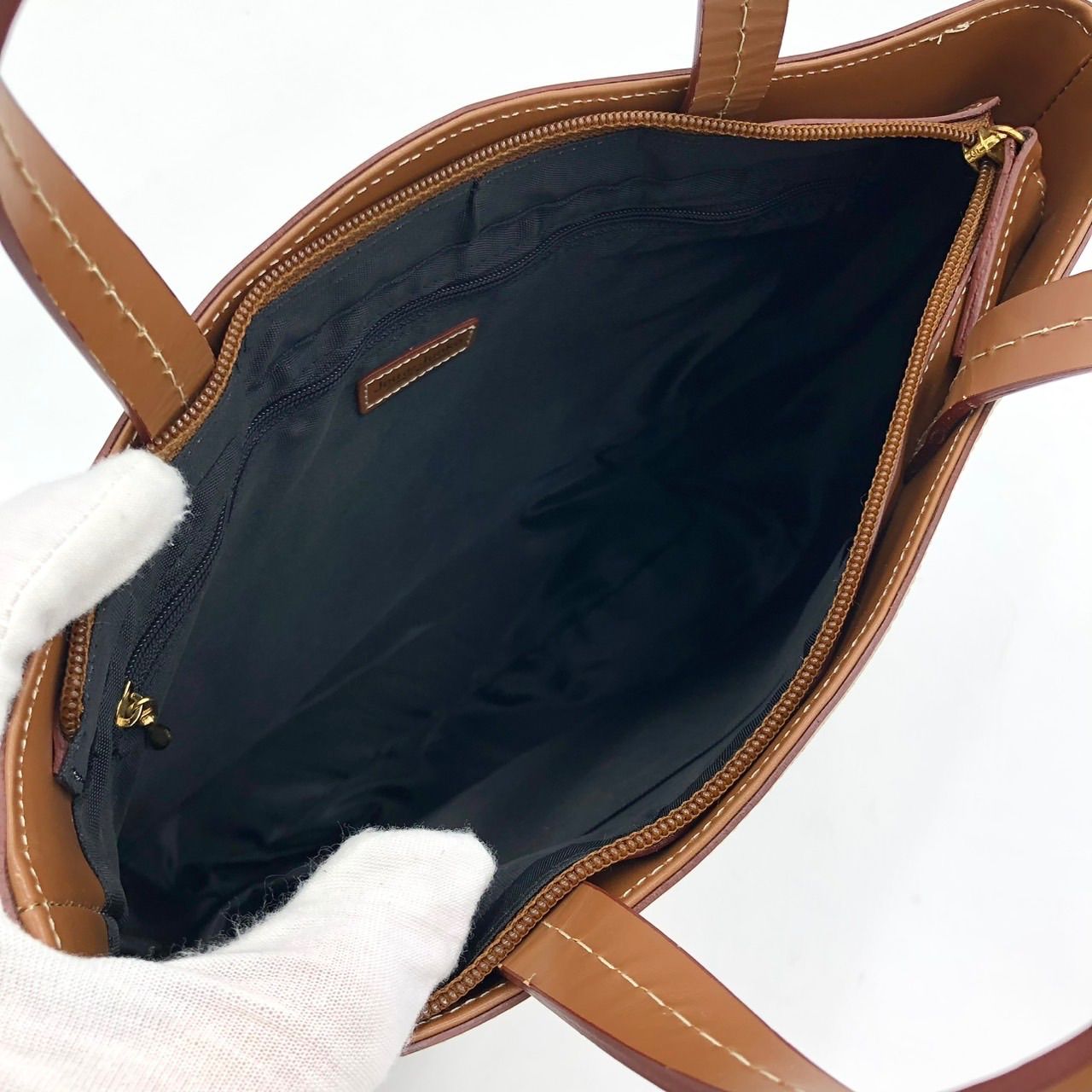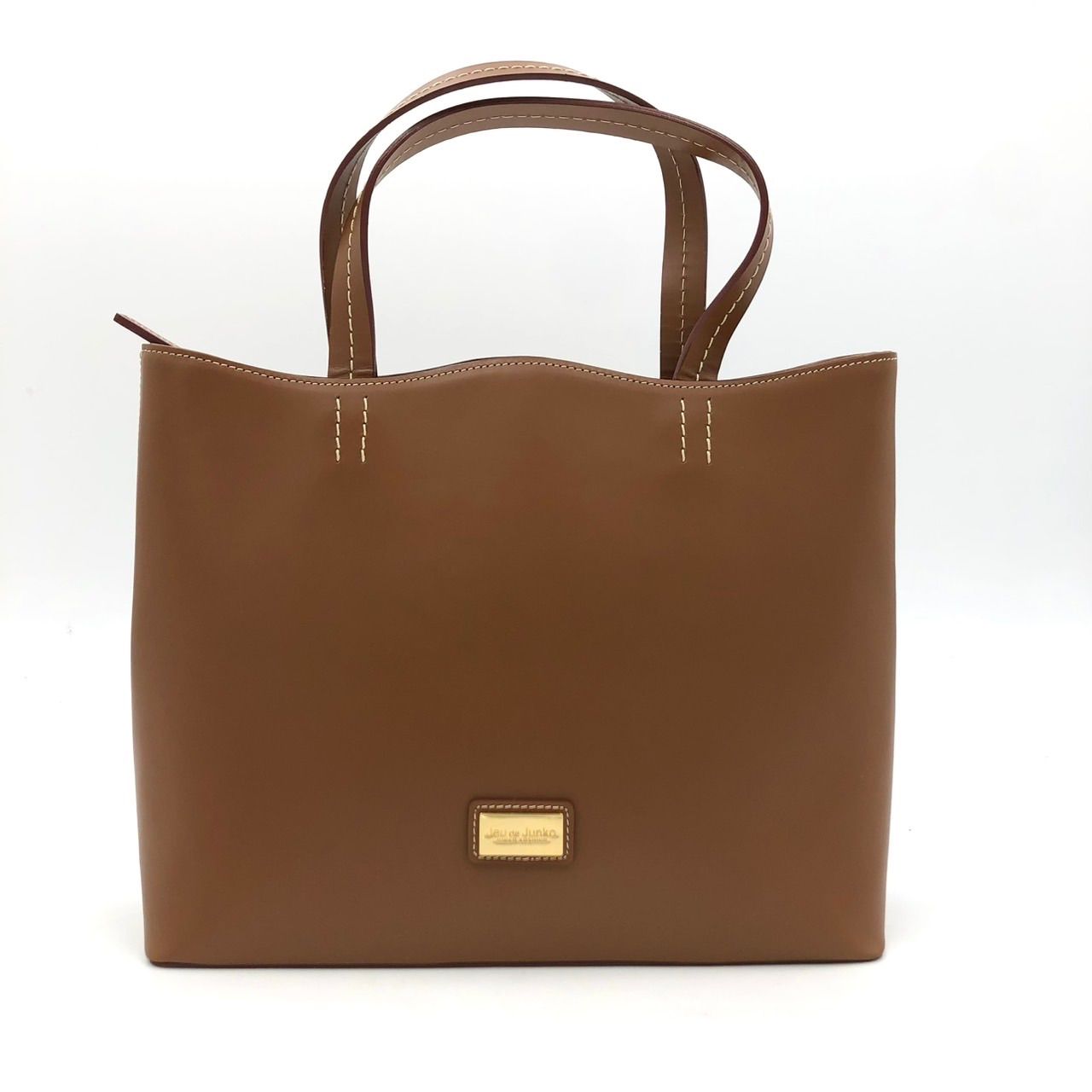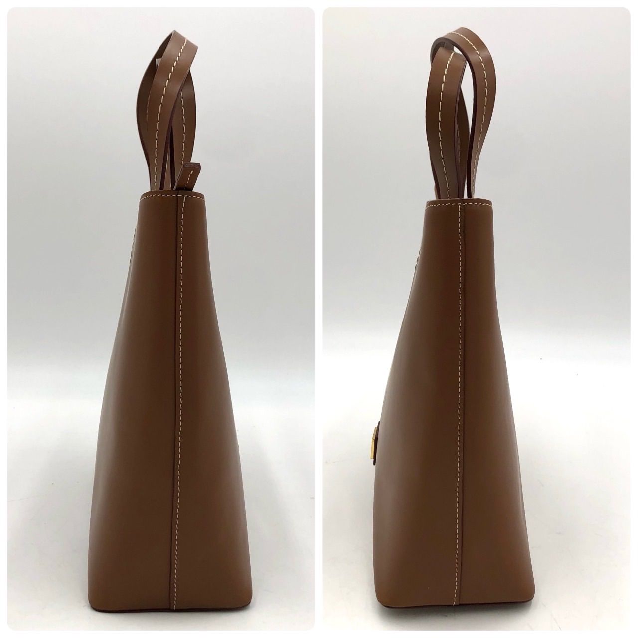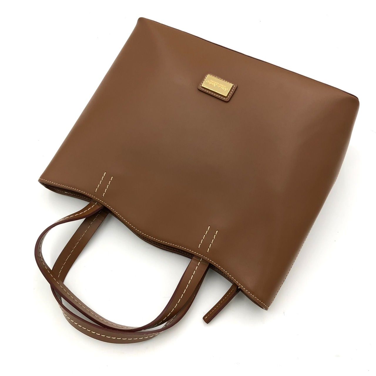 • シンプルで上品なデザイン: 合わせやすいブラウンカラーと、波打つようなトップライン、ゴールドのロゴプレートがエレガントなトートバッグです。