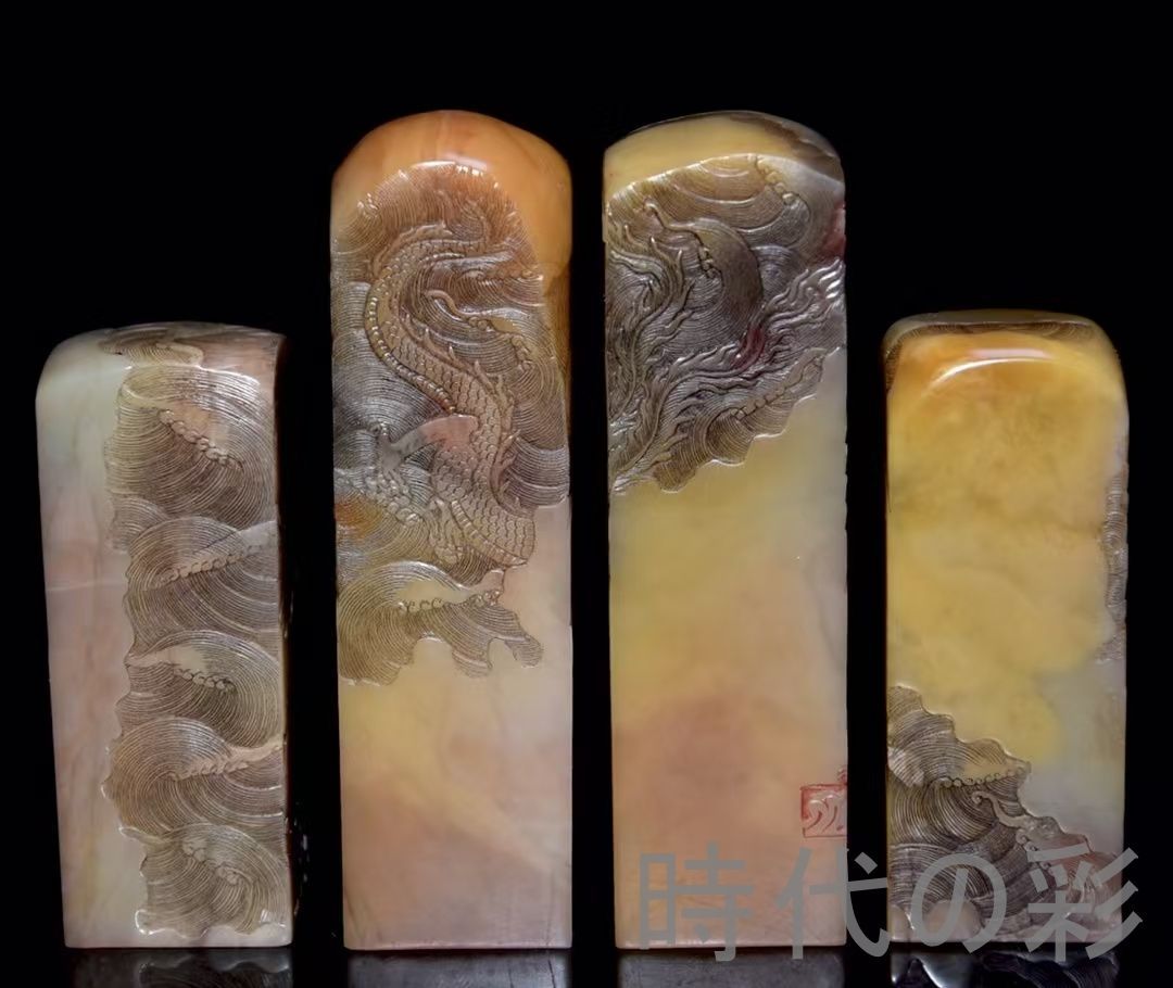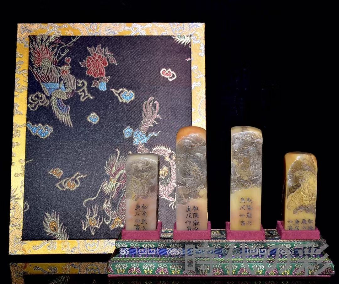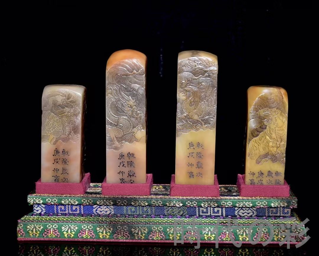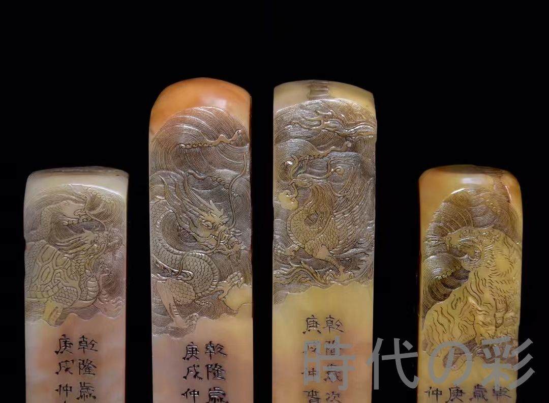田黄石製《四大神獣》套章(青龍・白虎・朱雀・玄武)。彫工は極めて精巧で石質は潤いと透明感がある。「乾隆歳次仲?」款。成套保存は非常に希少。