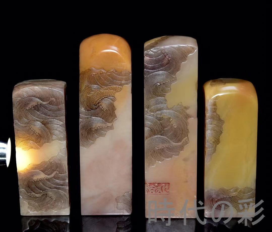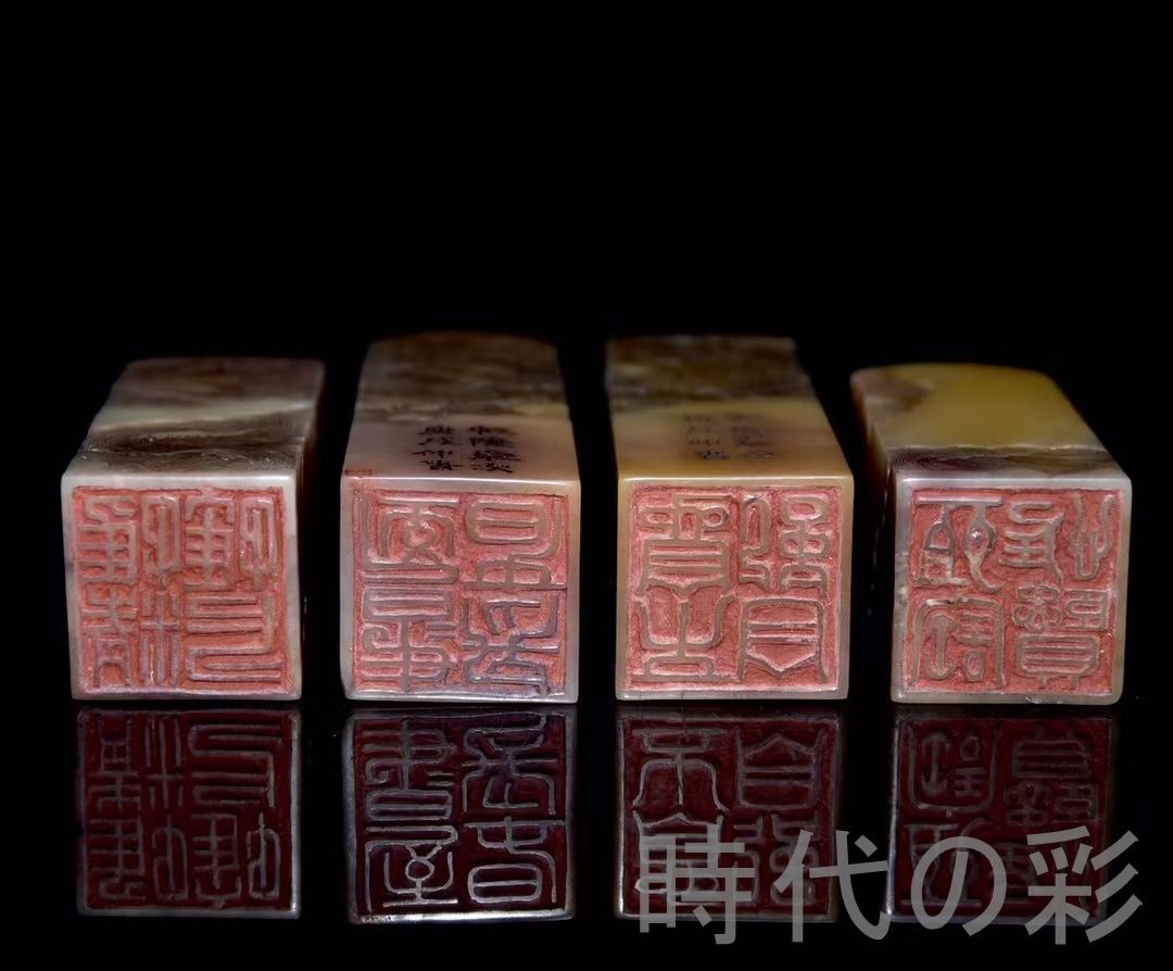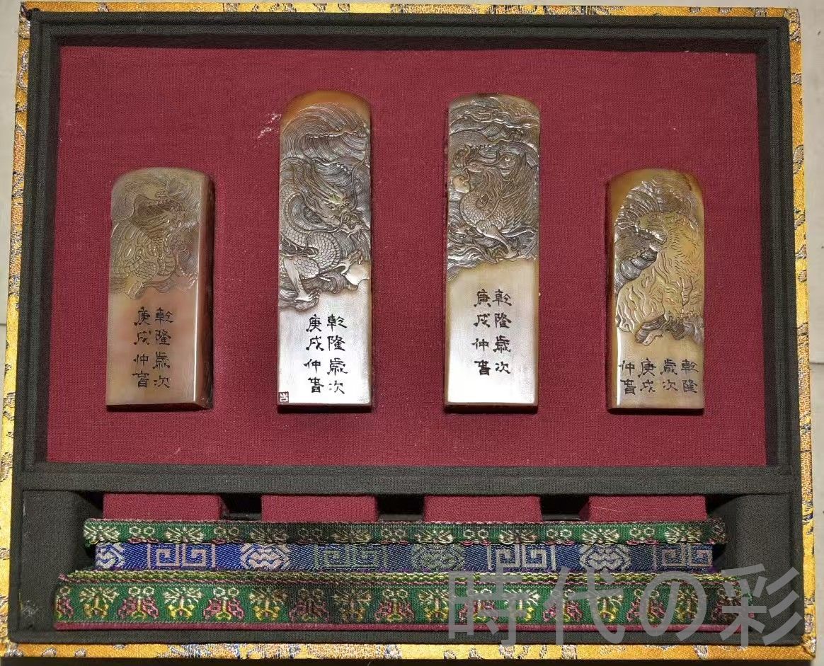 田黄石製《四大神獣》套章(青龍・白虎・朱雀・玄武)。彫工は極めて精巧で石質は潤いと透明感がある。「乾隆歳次仲?」款。成套保存は非常に希少。