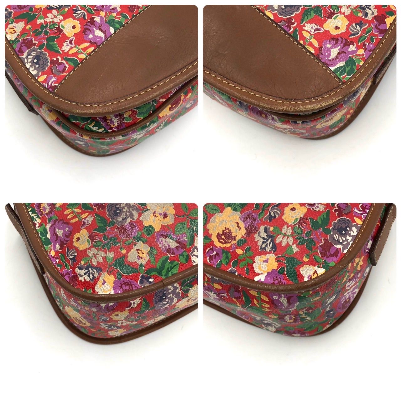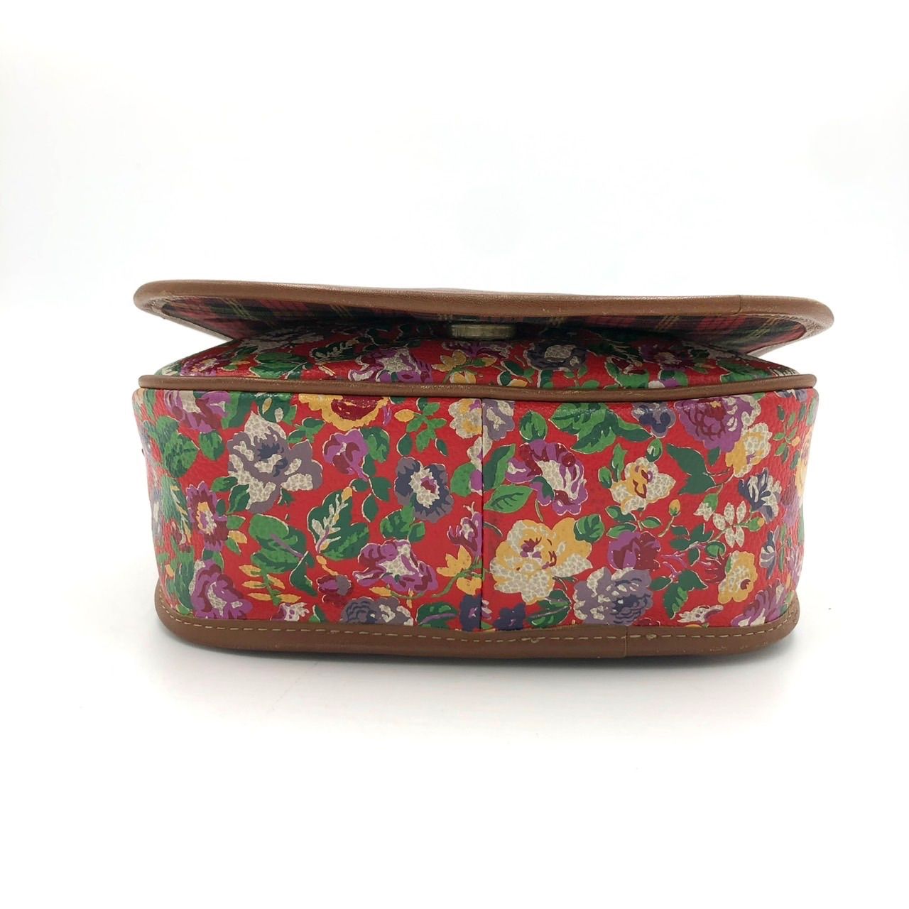 • フラップ部分の鮮やかな花柄と、ブラウンのレザー、内側のチェック柄(タータンチェック) のコントラストが非常に魅力的です。