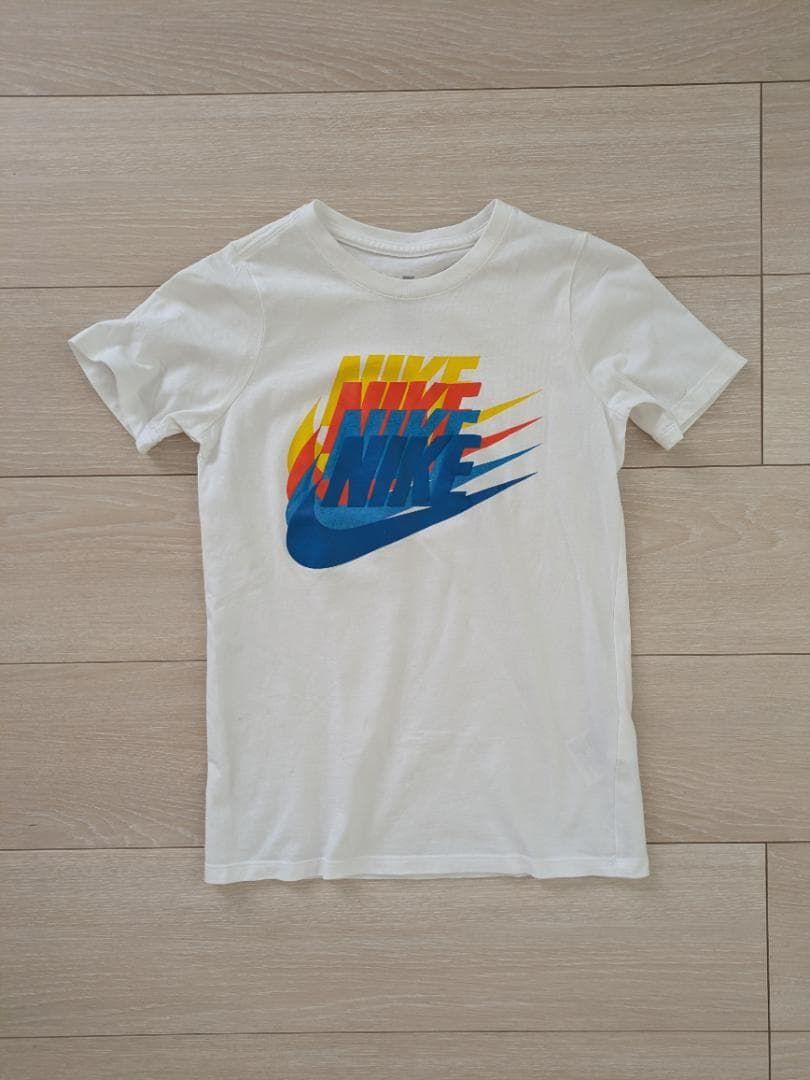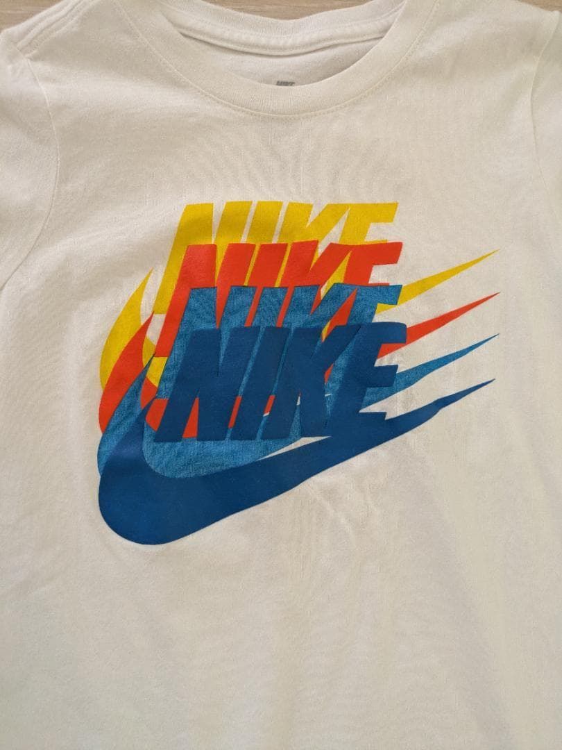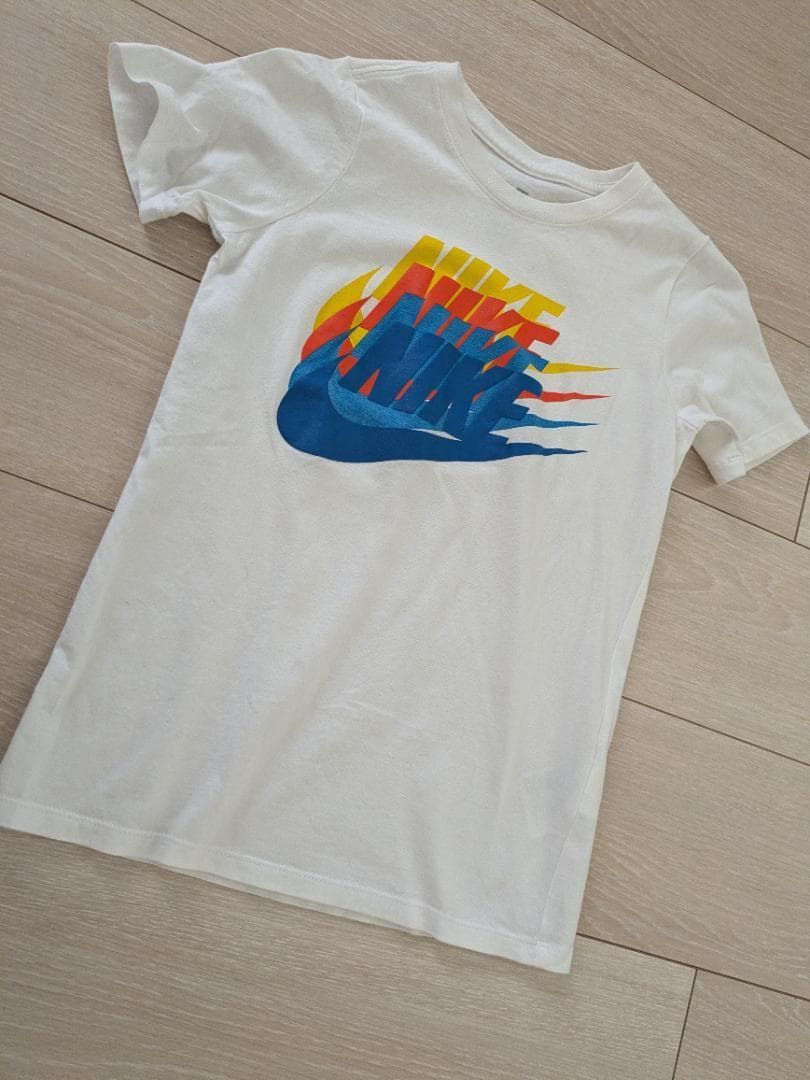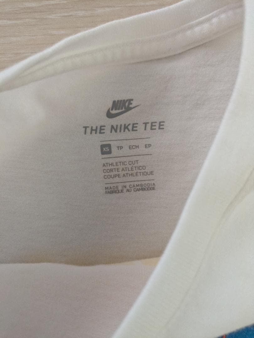 商品名:THE NIKE TEE サイズ:XS (アスレティックカット) カラー:ホワイト デザイン:正面にマルチカラーのグラフィックプリント(青、赤、黄色のスウッシュとロゴ)が施されています。 素材:コットン系の素材感です。 製造国:MADE IN CAMBODIA(カンボジア製)