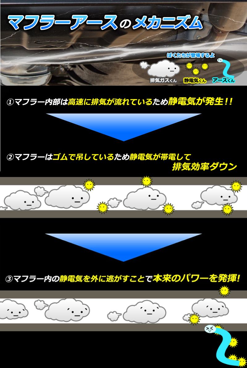 空気が移動するときに発生する摩擦は高回転になるほど大きくなります。マフラーの内壁には高回転になるほどプラスの電荷が増加し空気が通過しにくい現象が起こります。この製品を装着することによりプラスの電荷を効果的にアース処理し摩擦が低減し排気効率が大幅にアップします。排気効率がアップすることによりレスポンスが向上します。また、排気ロスの減少によりパワーとトルクがアップします。触媒付近に取り付けることによりスラッジが溜まりにくくなります。