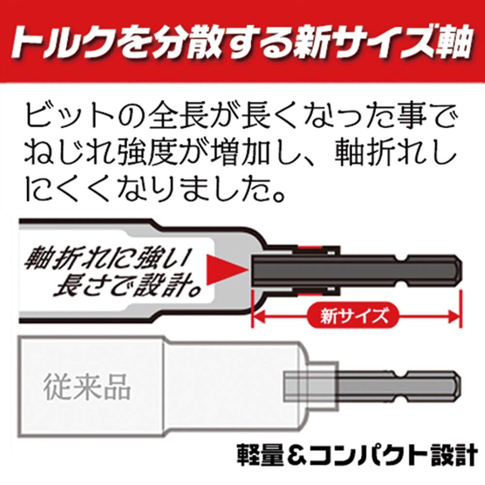 ●負荷のかかる軸部の全長を見直し、40V及び36V・18Vのハイトルクのインパクトドライバーを使用しても軸折れしにくい設計にしました。