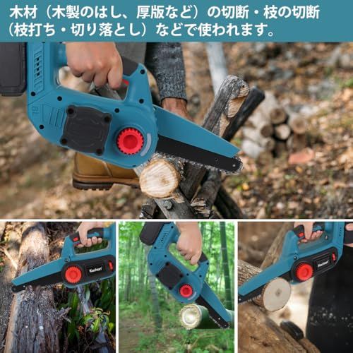 【充電式チェーンソーの仕様】型番:充電式チェーンソー KA-17 チェーン速度(無負荷):08,000 min-1(回転/分) ガイドバー長さ:8インチ、10インチ 最大切断可能幅:150 mm チェーン刃ピッチ:1/4" チェーン刃ドライブリンクゲージ:063" (1.6 mm) チェーン刃ドライブリンク数:45 オイルタンク容量:100 ml オイル給油方式:自動 電動機:アウターロータブラシレスモーター搭載 本体サイズ(約):36x16x12 cm 質量:約1.63 kg 付属品:チェーン刃・ガイドバー・チェーンカバー 生産国:中国