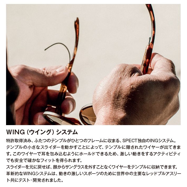 特許取得済み、ふたつのテンプルがひとつのフレームに収まる、SPECT独自のWINGシステム。