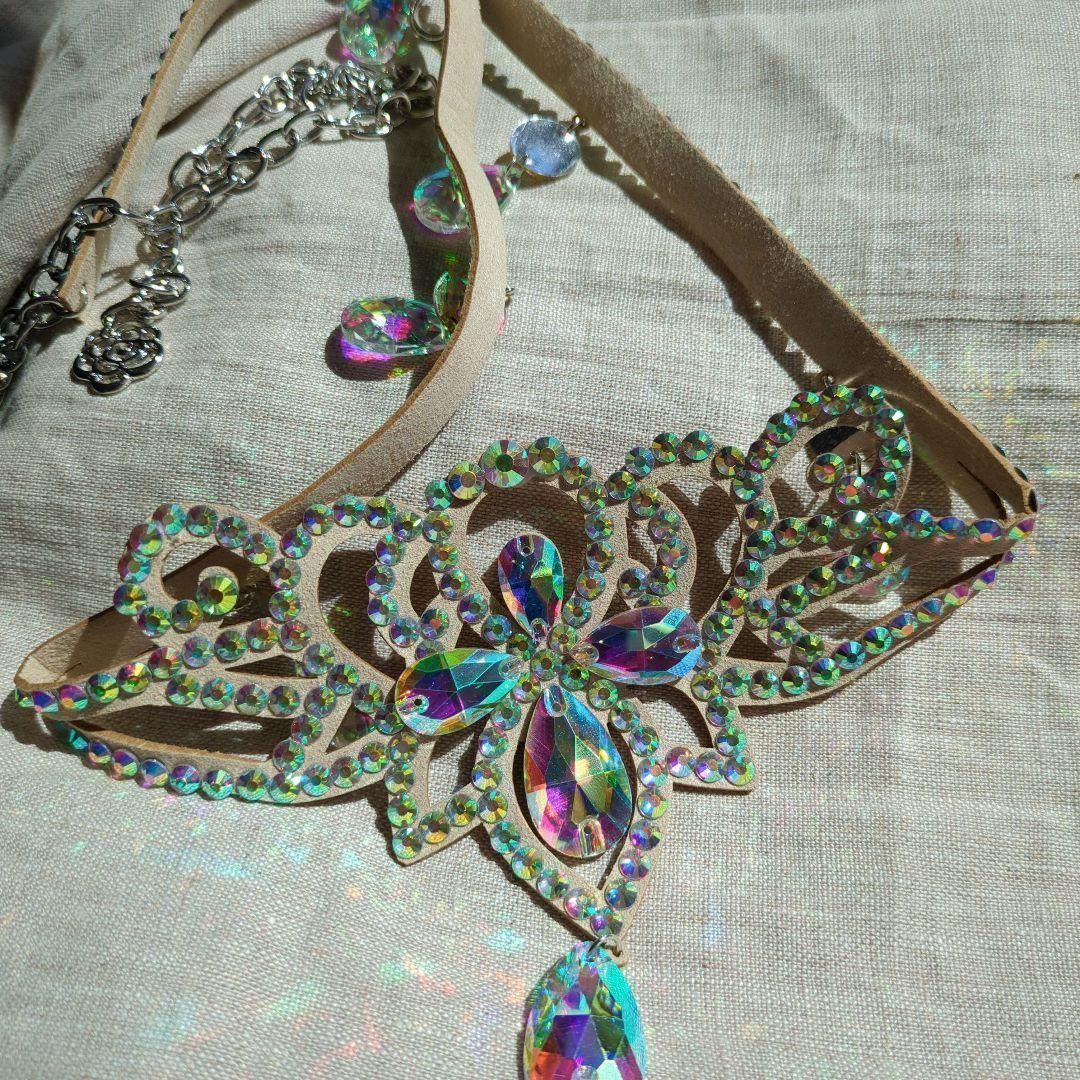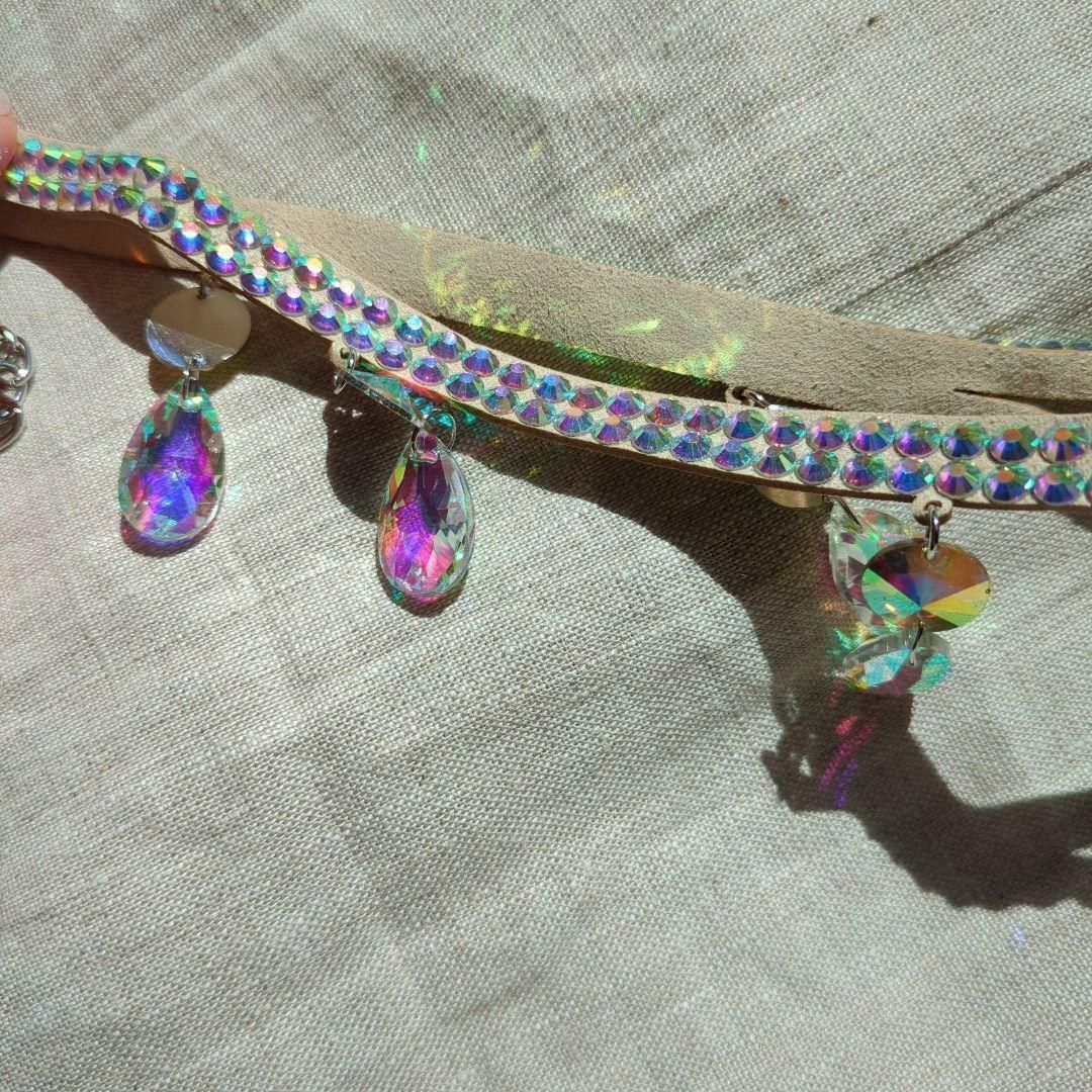 小さなラインストーンがベルト全体に散りばめられており、動くたびに光を反射して輝きます。