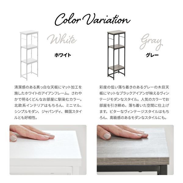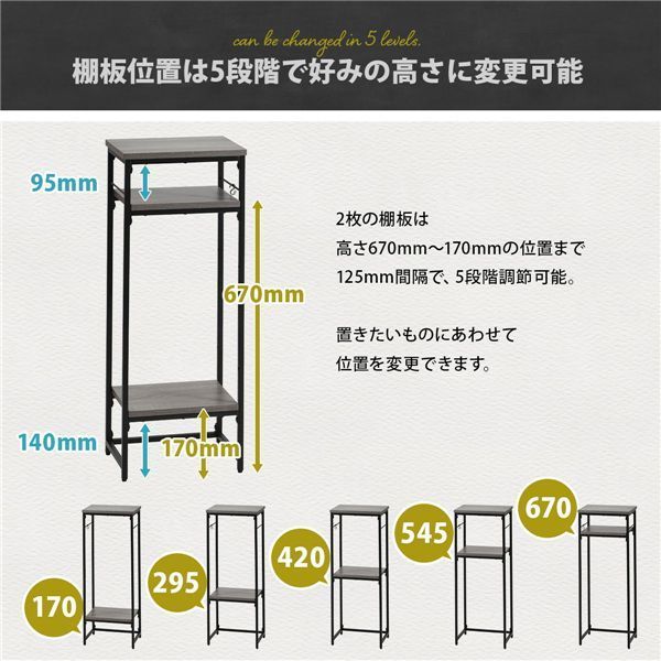 棚板の取り付け位置は5か所の中からお好みに合わせて選択頂けます。シャープで圧迫感の無い落ち着いたデザインとしておりますのでリビング、キッチンカウンター下の収納、サニタリー収納等、設置場所を選ばないマルチなラックとしてご使用可能です。フレームの両サイドにはフックを引っ掛けることも可能で、フックが2つ付属しております。