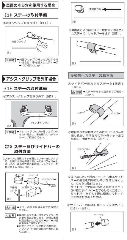 ●ステーの向き、取り付け場所、スペーサーの有無、オプションが必要かを適合表で確認し、取扱説明書に沿って装着ください。