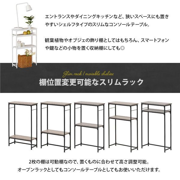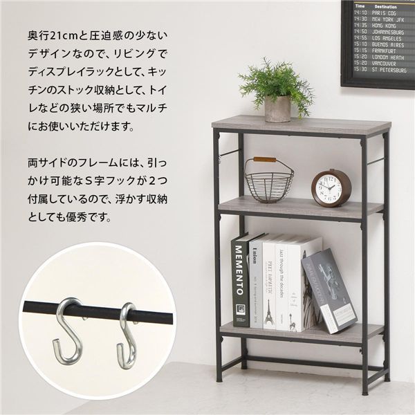 棚板の取り付け位置は5か所の中からお好みに合わせて選択頂けます。シャープで圧迫感の無い落ち着いたデザインとしておりますのでリビング、キッチンカウンター下の収納、サニタリー収納等、設置場所を選ばないマルチなラックとしてご使用可能です。フレームの両サイドにはフックを引っ掛けることも可能で、フックが2つ付属しております。