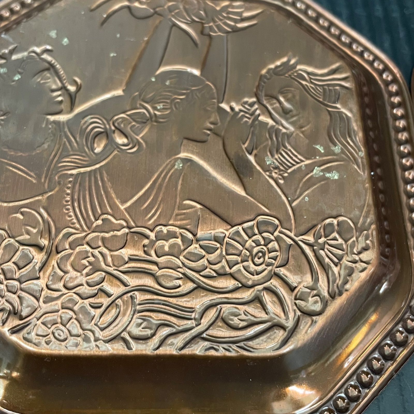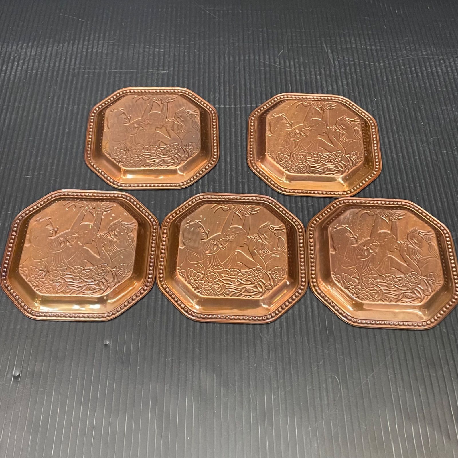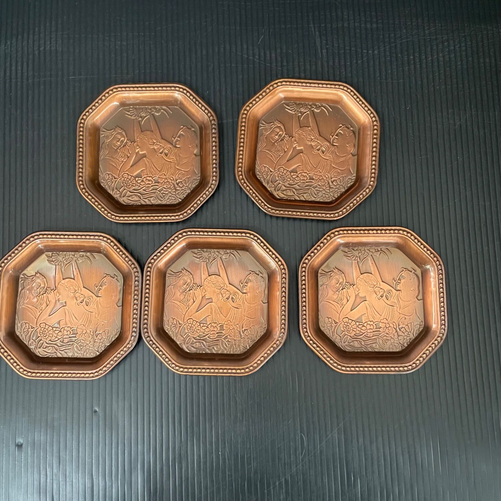 銅色の金属製コースターには人物のレリーフが施されており、落ち着いた雰囲気があります。