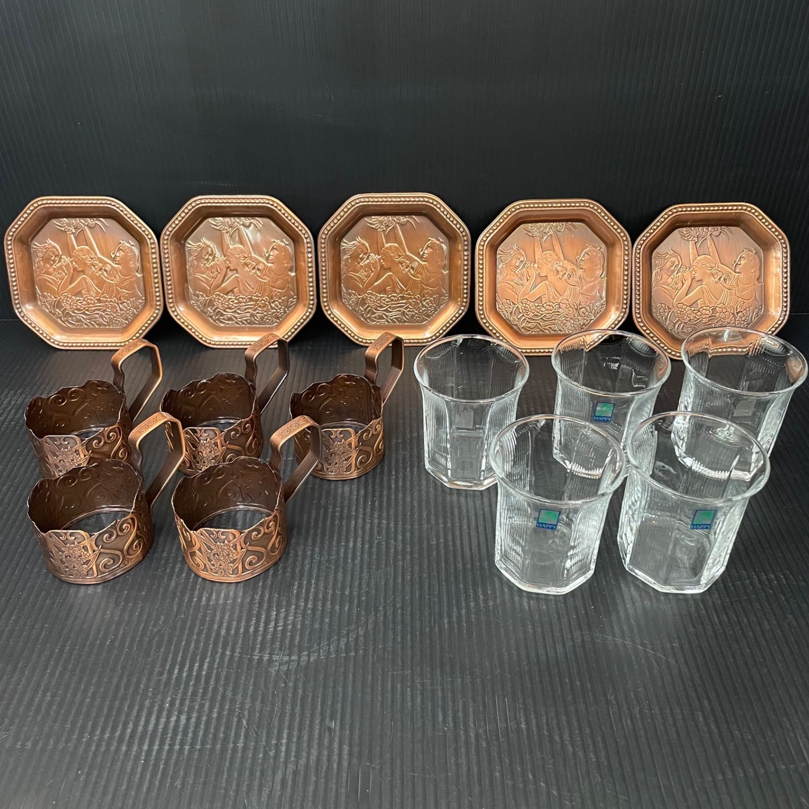 レトロ感のある、コースターとグラスホルダー、ガラスコップのセットの出品です。