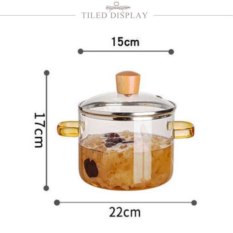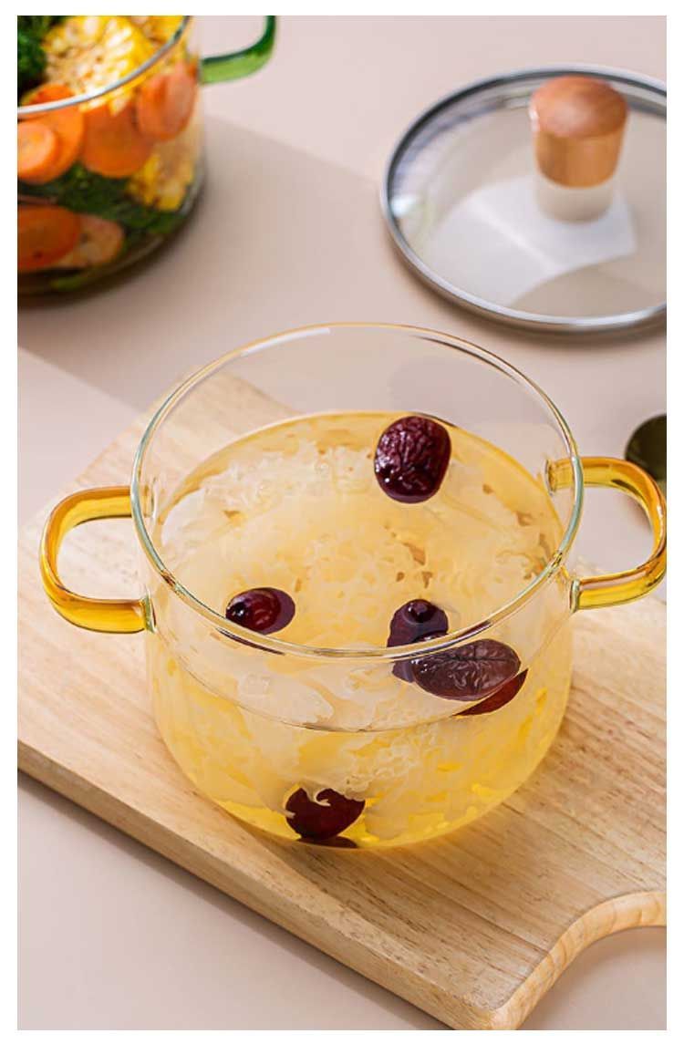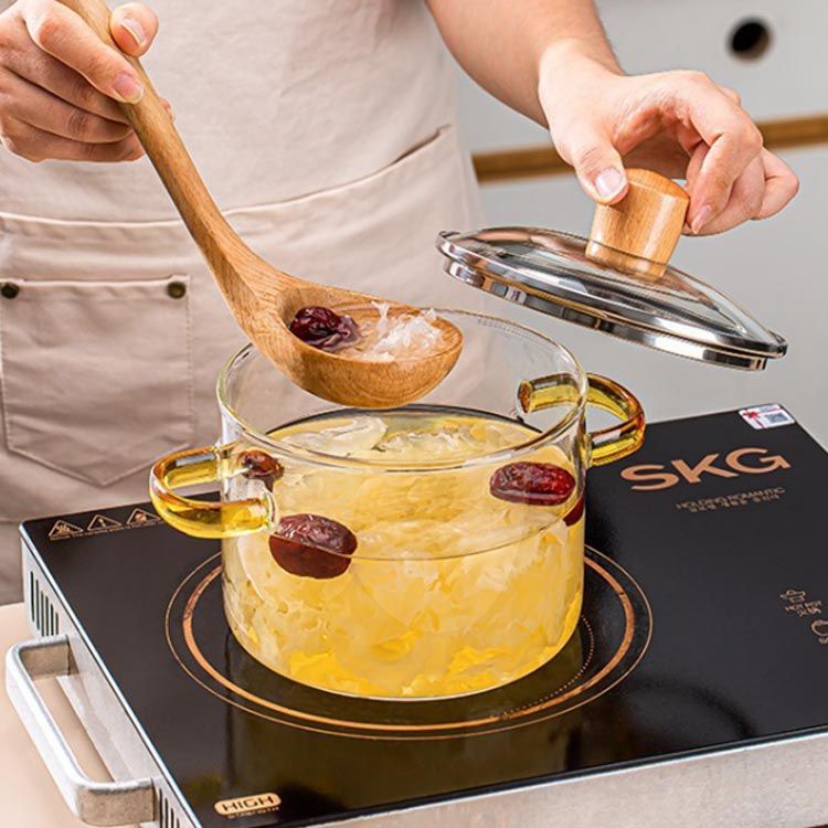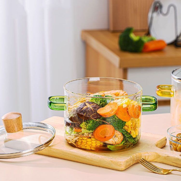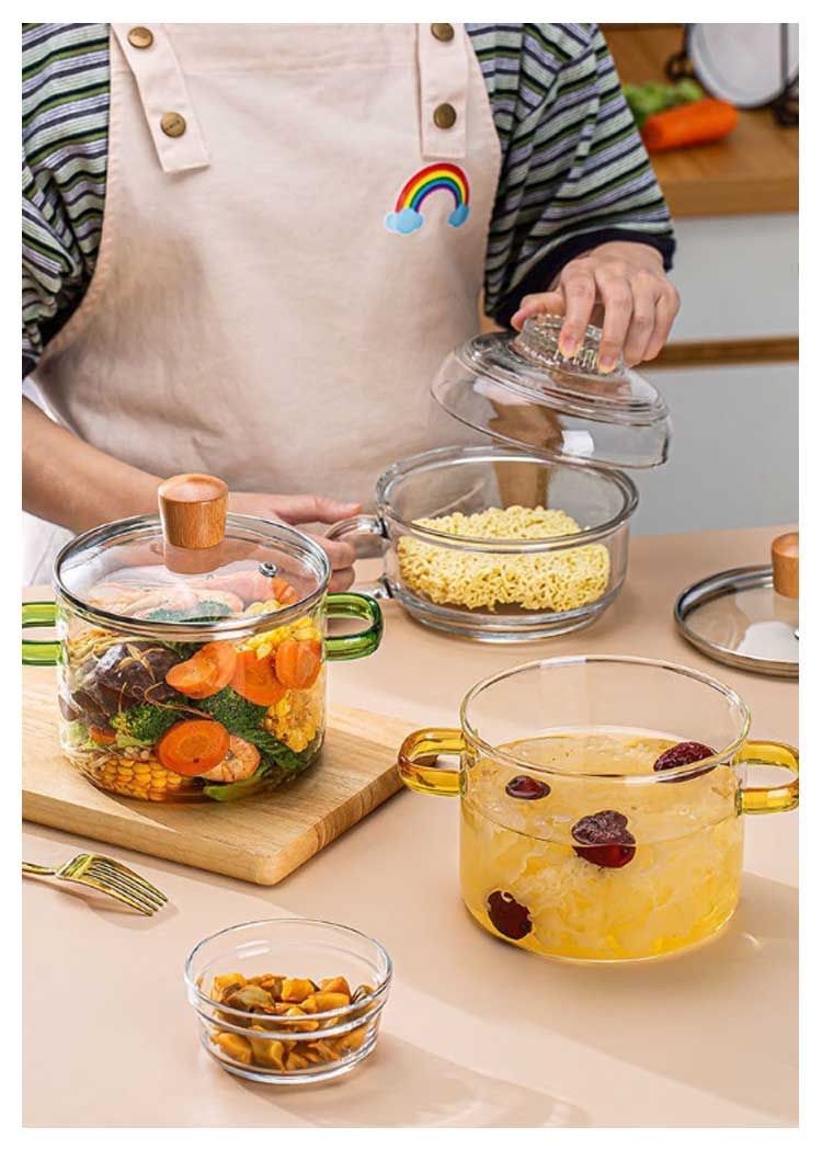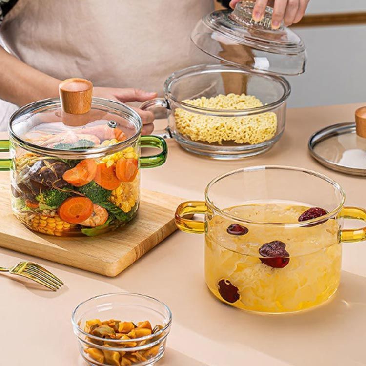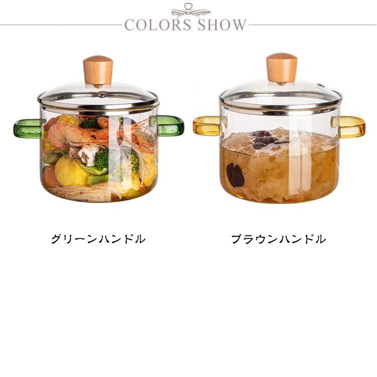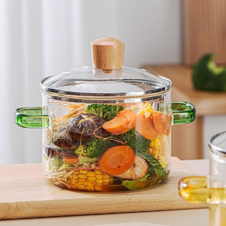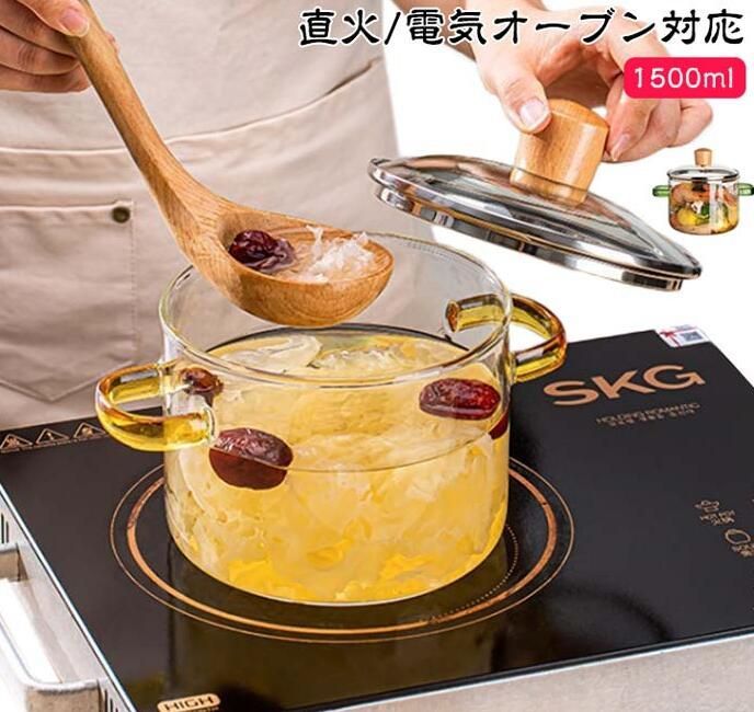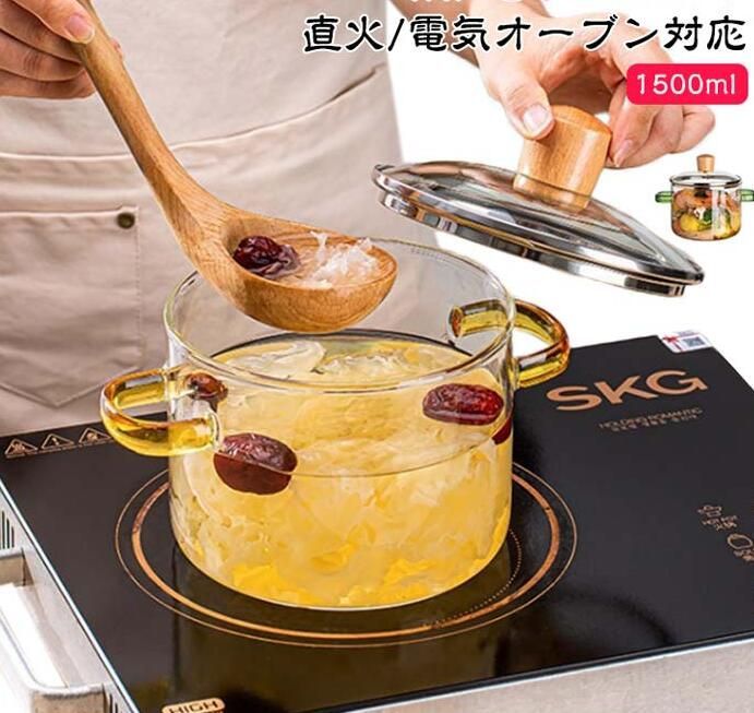 耐熱 ガラス 鍋 直 火 で 使える ガラス 鍋 ガラス鍋透明ガラススープ鍋 家庭料理 木製フタ付き 取っ手付き 電子レンジ対応 直火対応 耐熱性 煮込み鍋 1.5L 焦げ付き防止加工 ガラス鍋 透明#shbwdd3670