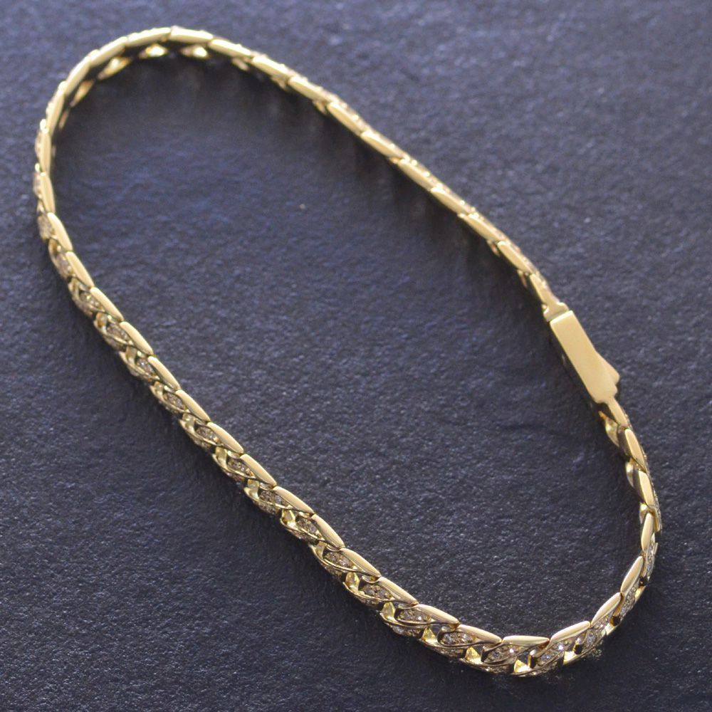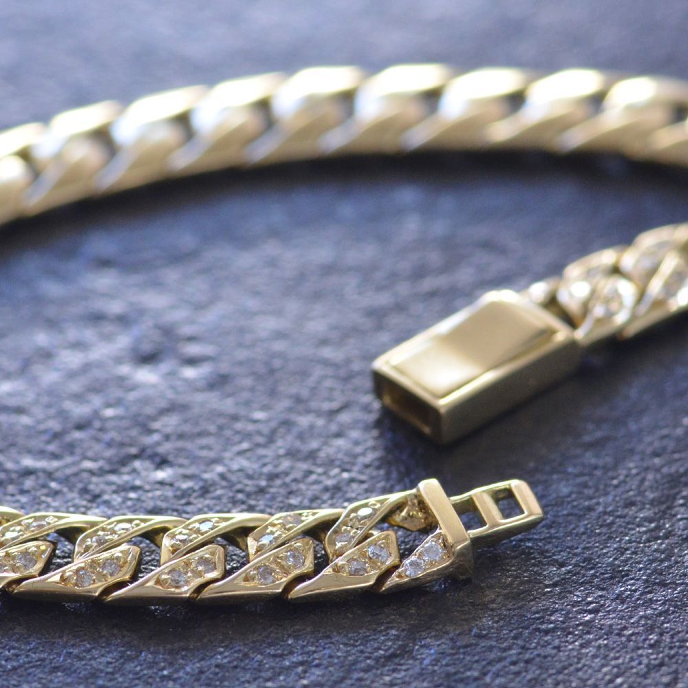 片面にダイヤモンドをセットした喜平ブレスレットです。ゴツゴツした重みのある喜平ではなく細身でさらりとした着け心地なので女性でもお楽しみいただけます。喜平は地金のみの面とダイヤモンド入りの面リバーシブルでお使いいただけます。留め金部分はワンタッチで取り外しができ使い勝手抜群。サイドストッパーが無くすっきりとしたデザインです。ダイヤモンドは全石、無色透明G~Hカラー、SIクラス、Goodカット程度で照りのある上質なものを厳選。長さ指定作成可能で男女ペアジュエリーとしても多数ご注文いただいております。ご注文をお受けしてから国内工房の職人が手作業でお作り致します。