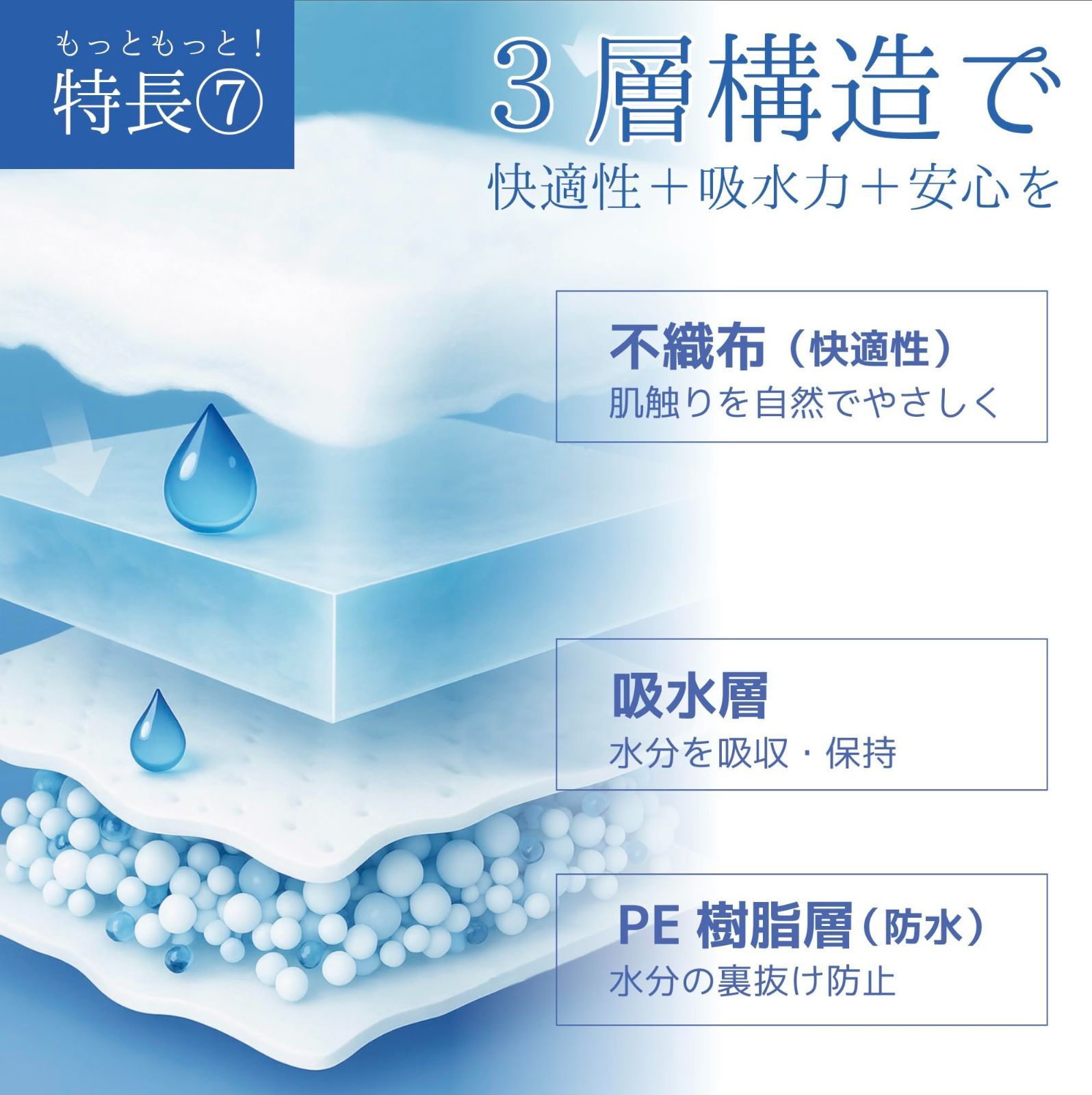 【3層構造でやわらかなつけ心地を実現】肌に触れる部分をふわっとした不織布で構成、2層目には吸水層、3層目に防水の樹脂層を有し、さらっとした快適なつけ心地と防水力を兼ね備えました。さらに銀イオンを配合、ニオイ対策にも。