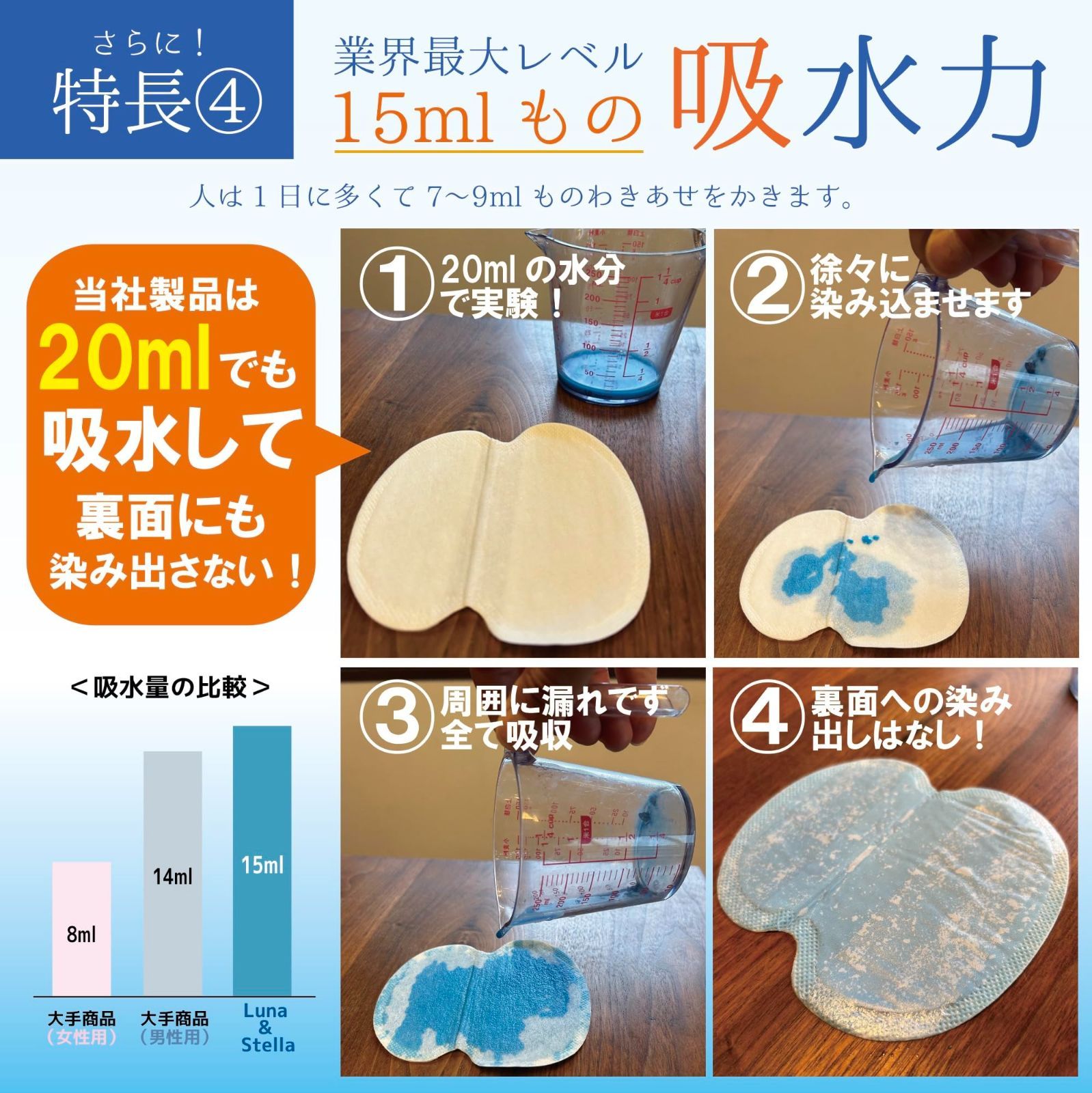 【汗を多くかいても安心な吸水力】3層構造によって大量のわきあせもしっかり吸水。15mlの高い吸水量で、汗っかきの方や夏の暑い日にも安心してお使いいただけます。