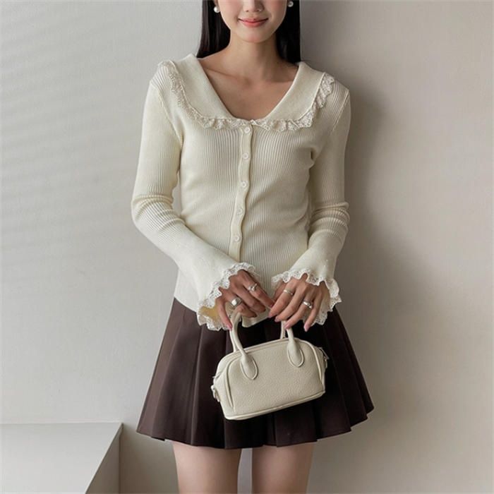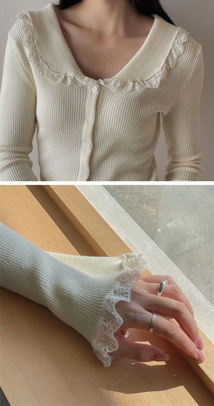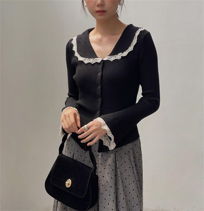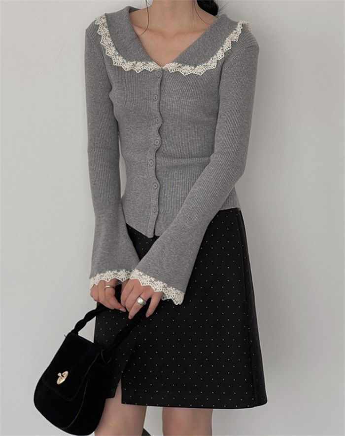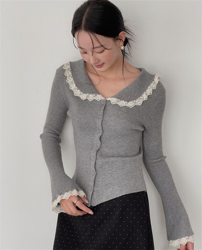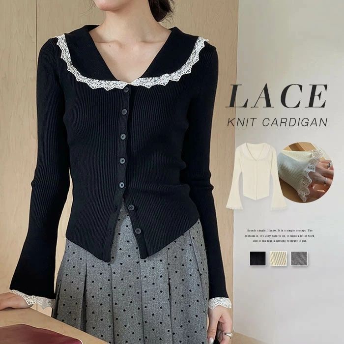 ニット カーディガン 即購入OK レース 切り替え ニットトップス レディース 大きめカラー 長袖 フレア袖 リブ編み 前開き トップス 着回し 通勤 きれいめ オフィス ストレッチ素材 楽ちん ファッション おしゃれ 春 秋