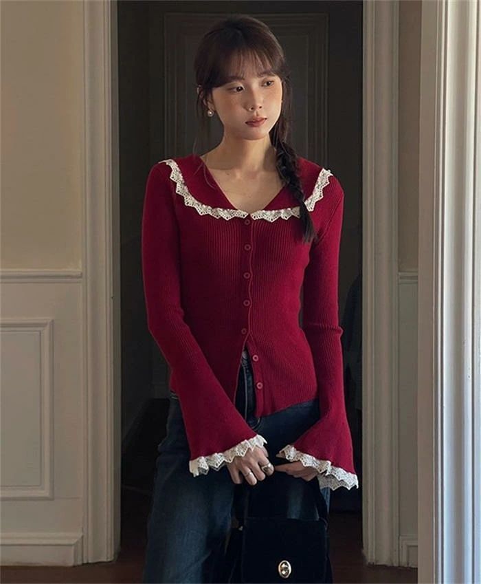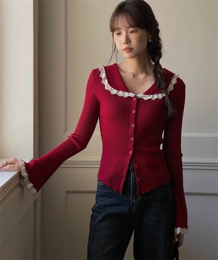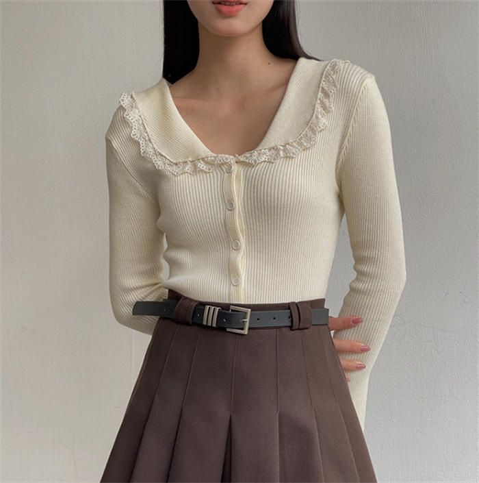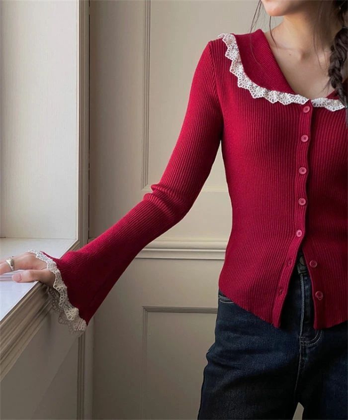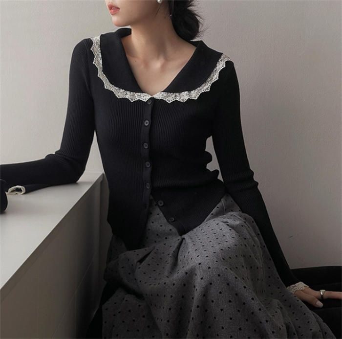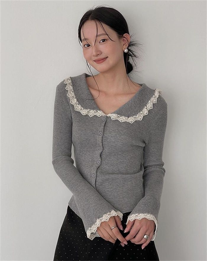 ニット カーディガン 即購入OK レース 切り替え ニットトップス レディース 大きめカラー 長袖 フレア袖 リブ編み 前開き トップス 着回し 通勤 きれいめ オフィス ストレッチ素材 楽ちん ファッション おしゃれ 春 秋