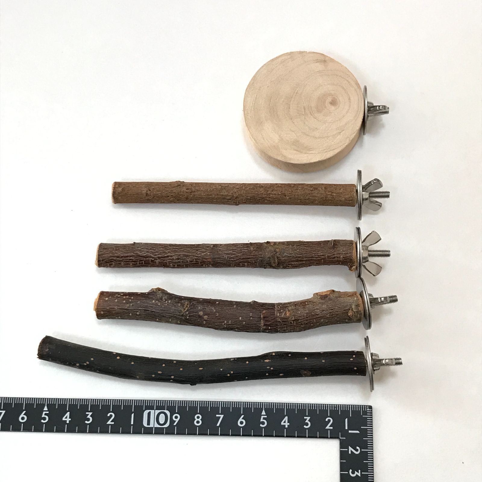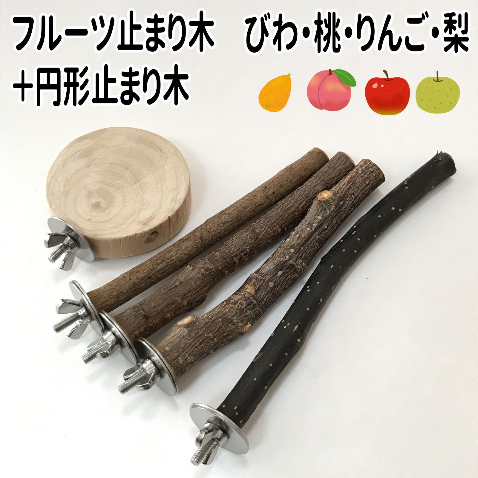 びわ・桃・りんご・梨を使ったとまり木と円形止まり木のセットです。