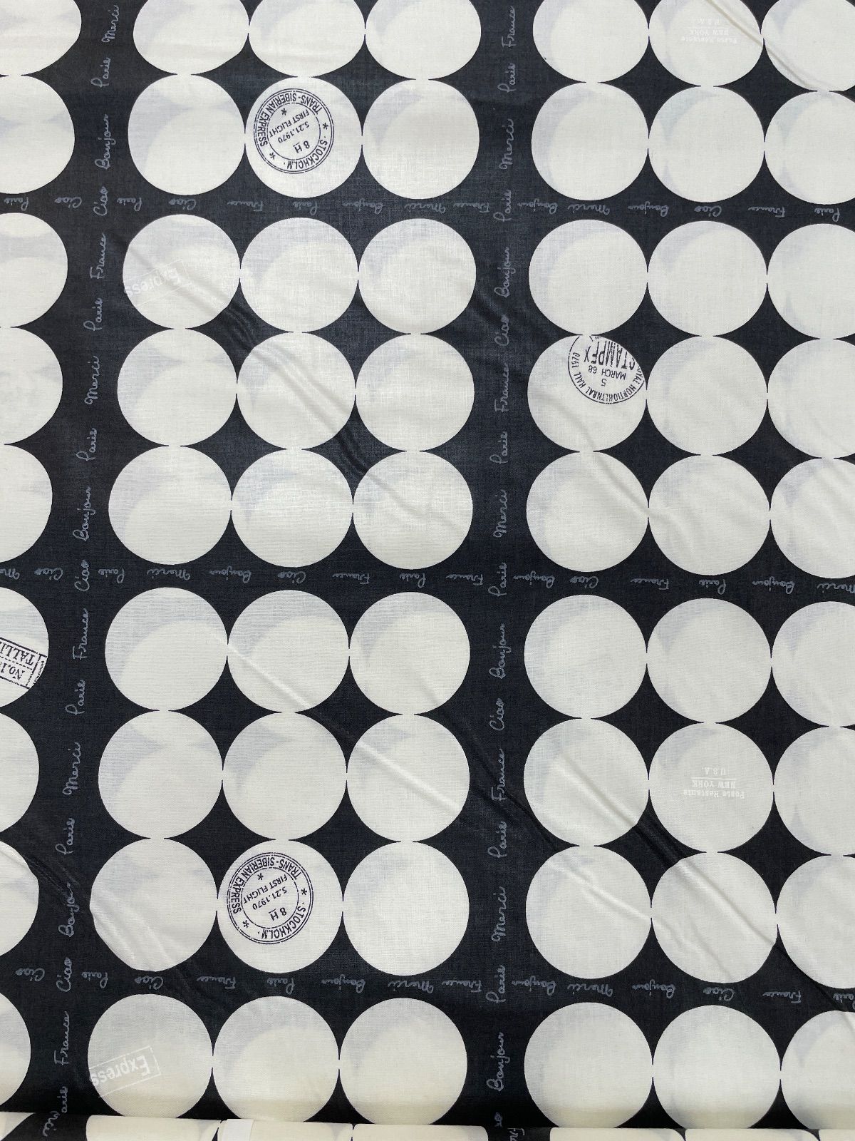 黒地に生成りの丸が並ぶ柄の生地です