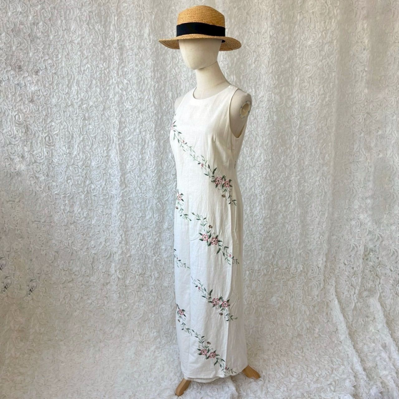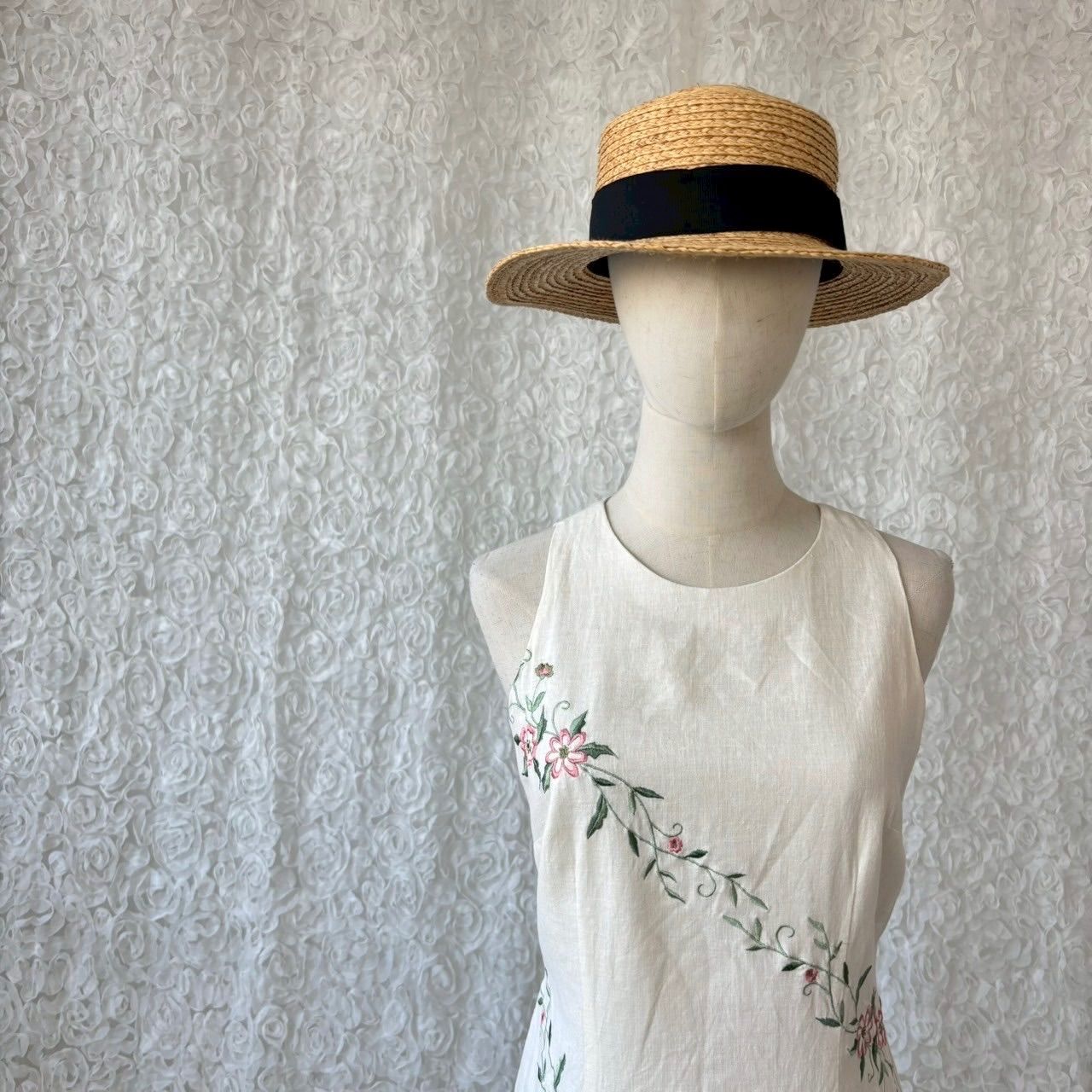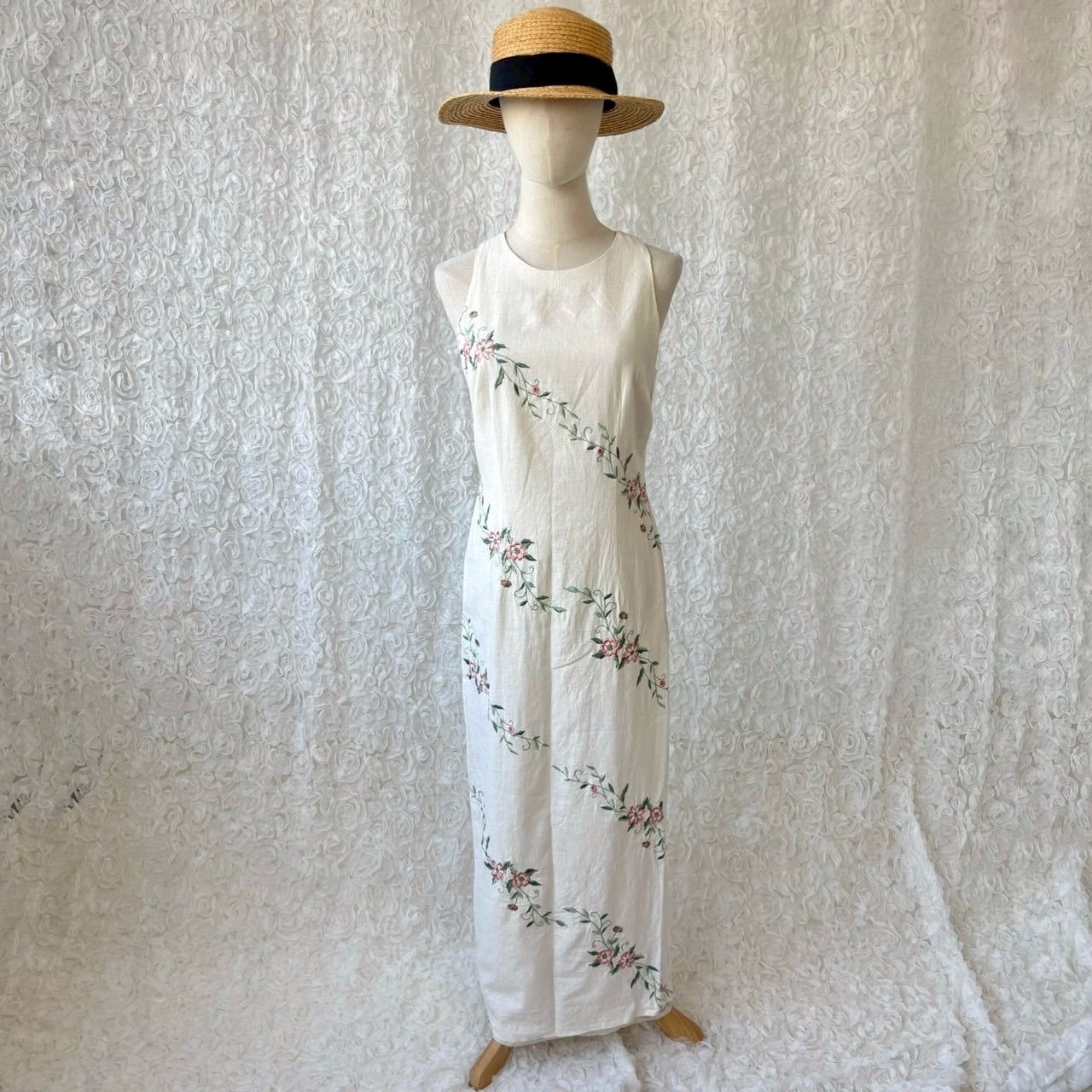 ナチュラルな風合いのリネン混素材に、斜めに流れるフラワー刺繍が上品に映える一着。
