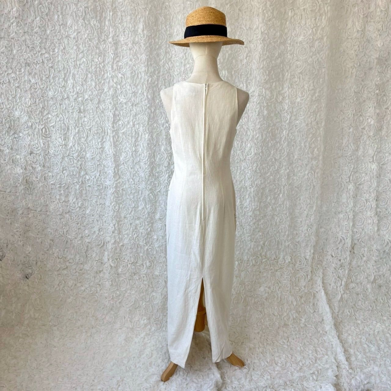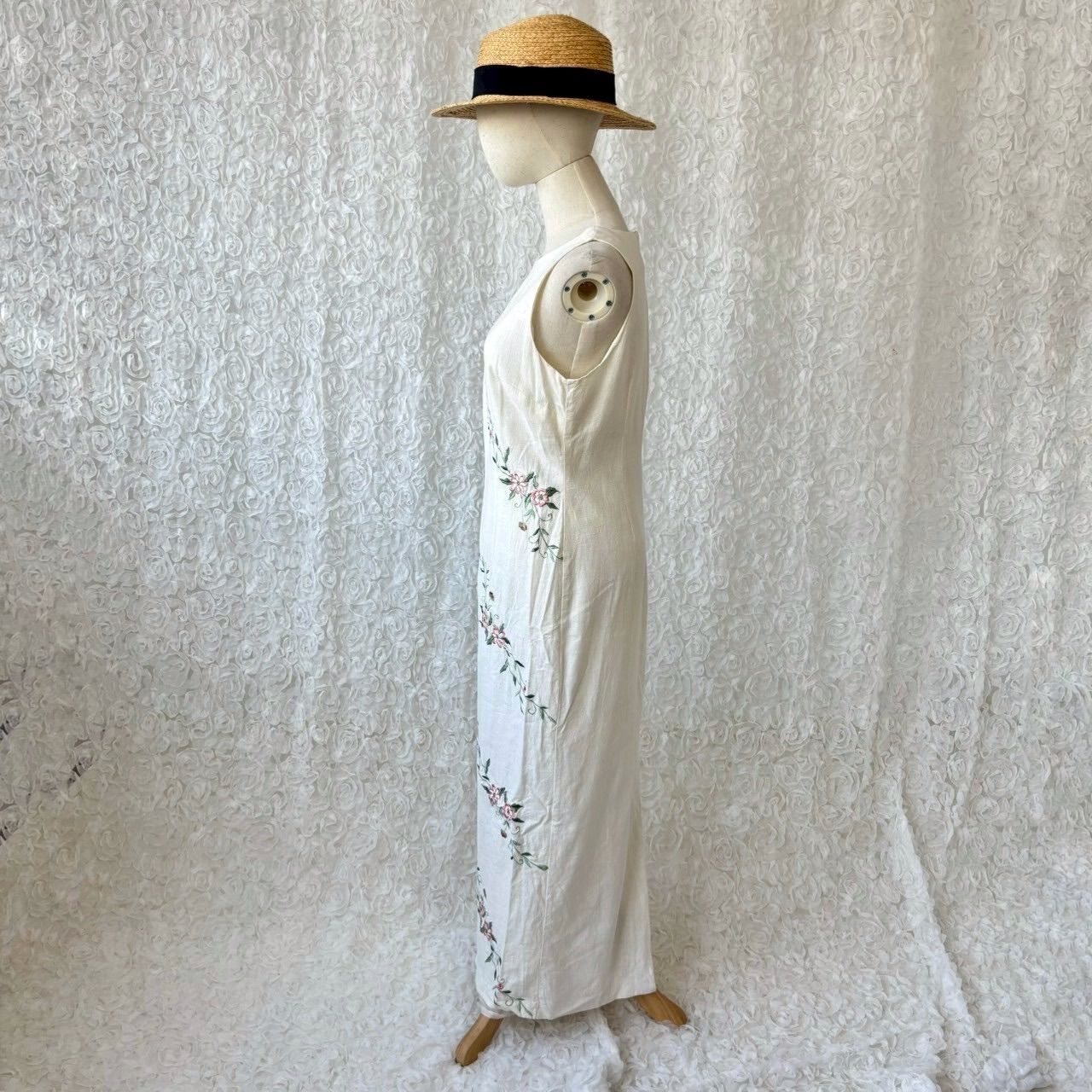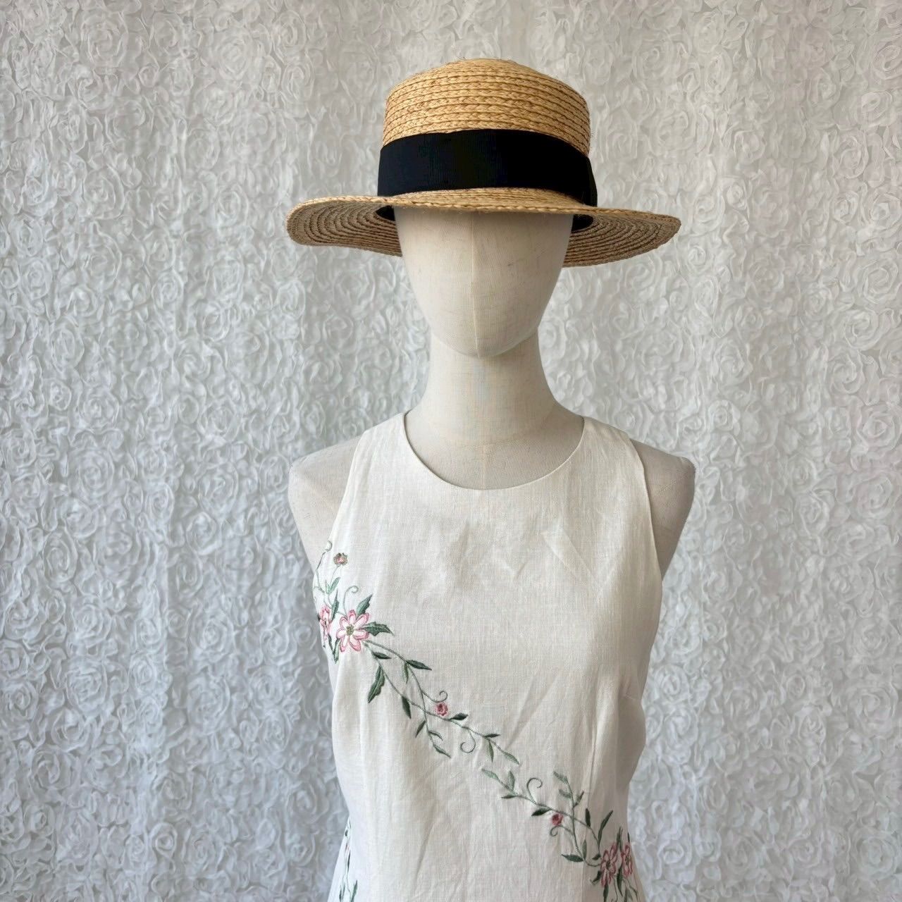 ナチュラルな風合いのリネン混素材に、斜めに流れるフラワー刺繍が上品に映える一着。