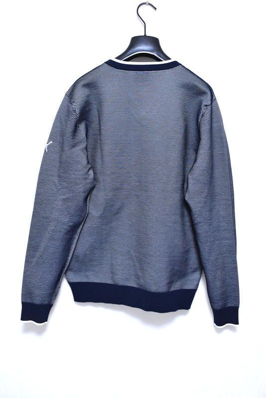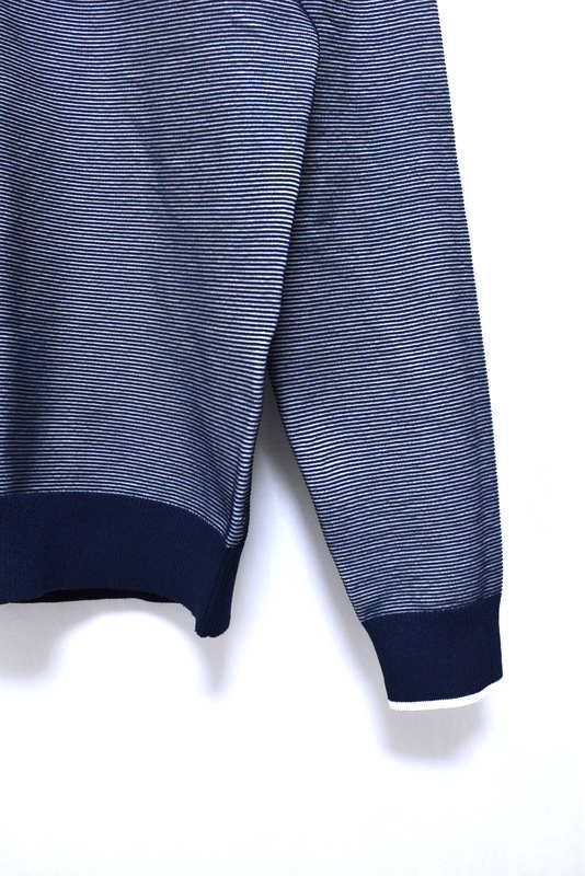 細ピッチのボーダー柄が爽やかな印象を与えるVネックプルオーバーです。