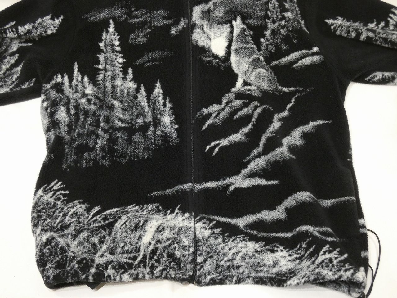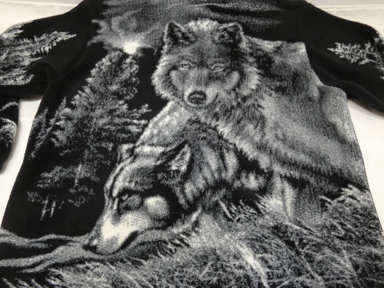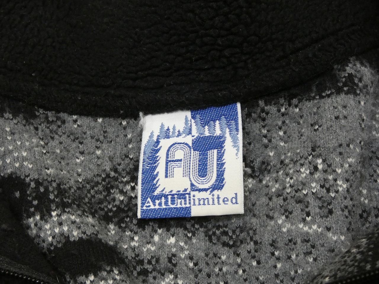 こちらは、90年代頃のアメリカ製 アートアンリミテッド オオカミ 総柄 フリース ジャケットになります。