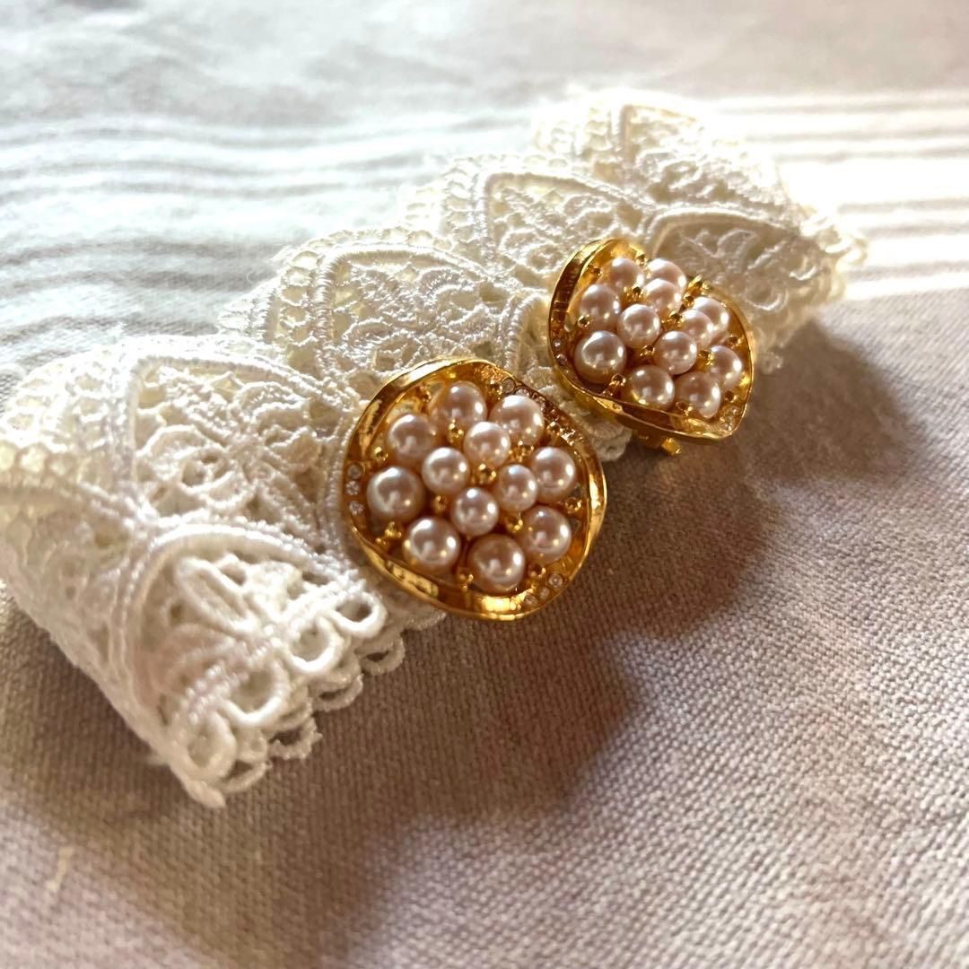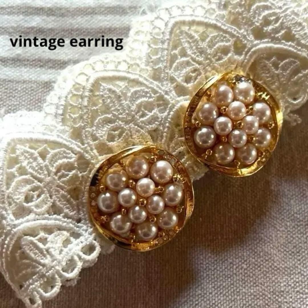 パールとゴールドのつぶつぶが華やかな大ぶりのビンテージイヤリングです。大ぶりながらもきちんとした品格があるアイテム