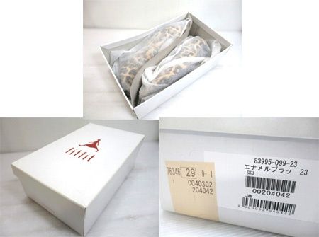 本体中敷きつま先側などに黒ずみなどの汚れ、靴裏に擦れや汚れ、外箱に多数の傷や擦れ、角擦れ、黄ばみ、汚れの付着が見受けられます。