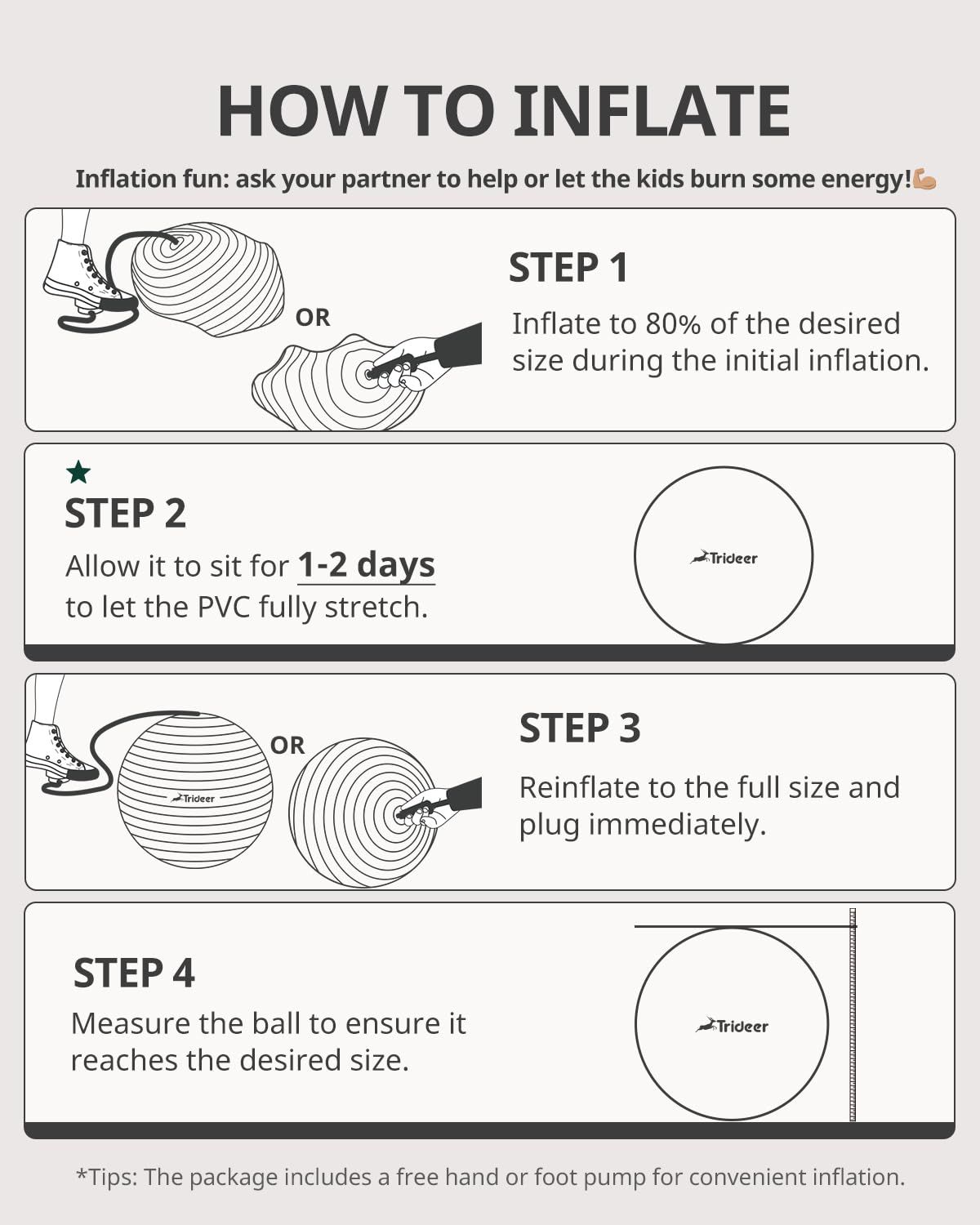 - 最初はボールの直径の約80%まで膨らませます。 さらに24時間待ってから、推奨サイズに膨らませてください。 最初の24時間はボールの使用を避けてください。