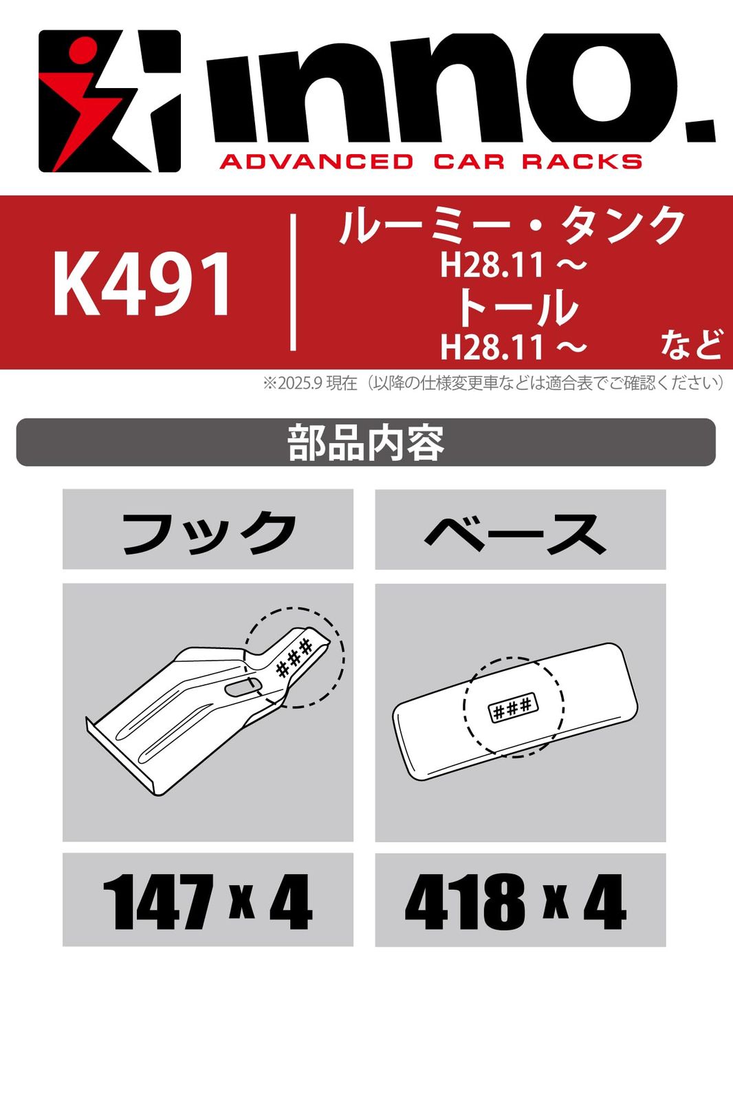 カーメイト(Carmate) inno(イノー) ベースキャリア 車種別フック 適合車種: ルーミー H28.11~ (M900A / M910A) タンク H28.11~R2.9 (M900A / M910A) トール H28.11~ (M900S / M910S) 等 ←こちらの車両にINNO ベース キャリア を取り付けする際に必要なパーツです K491