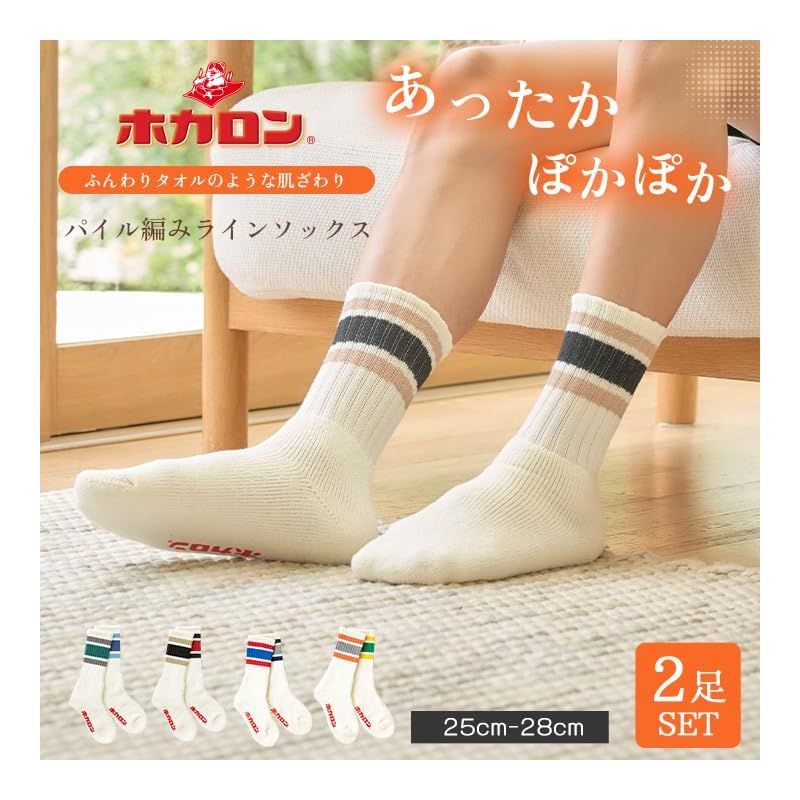【新品】 [ホカロン] 靴下 メンズ ラインソックス パイル 25-28cm 2足セット レッド ネイビー 1