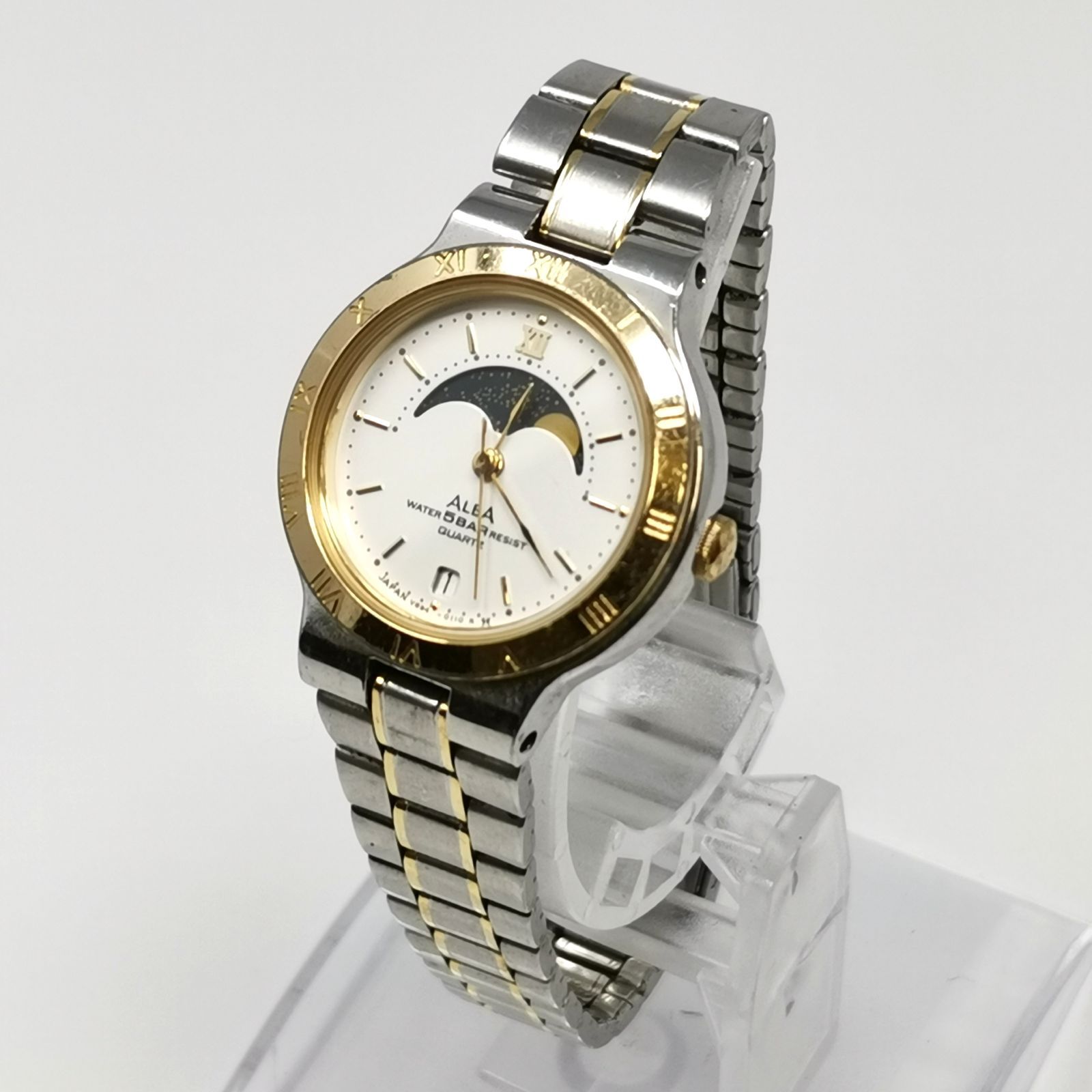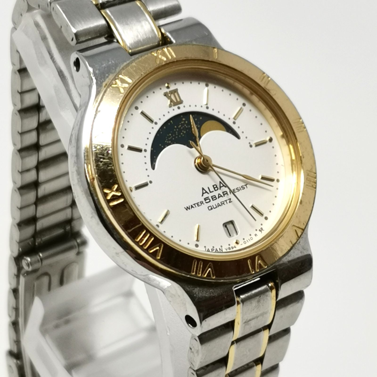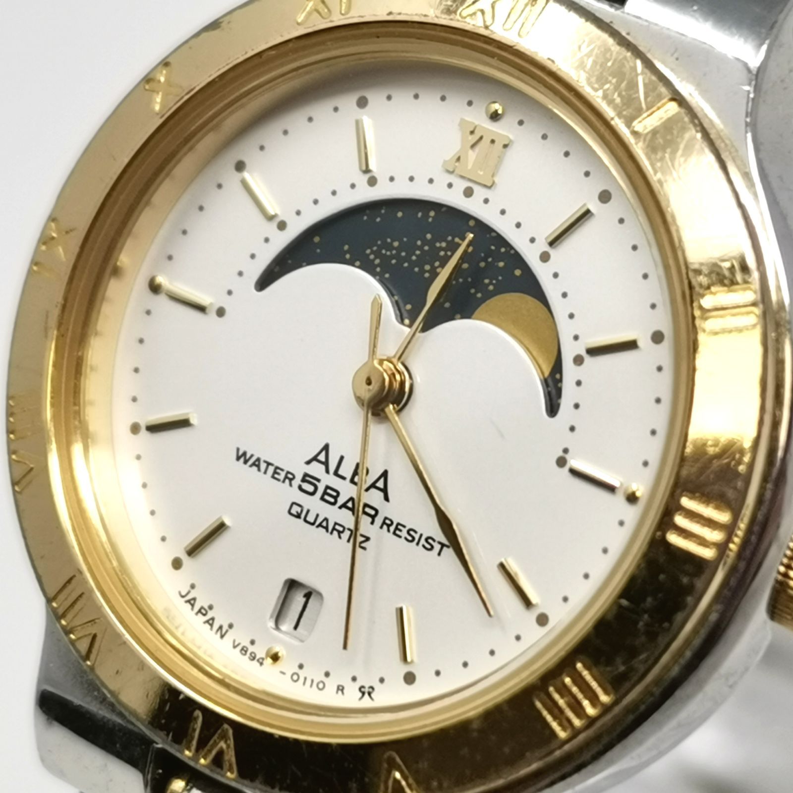 ALBA アルバ ムーンフェイズ クオーツ デイト V894-0060 レディース腕時計 文字盤ホワイト 電池切れのため動作未確認 管理番号KKVHAKO94
