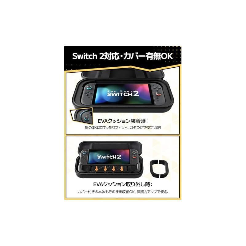 【2WAY対応デザイン】 Switch 2(2025年モデル)専用設計の保護ケースです。取り外し可能なEVAプロテクションパッドを採用しているため、本体にカバーを装着した状態でも、カバーなしの素の状態でもぴったりフィット。内蔵のマジックテープが本体をしっかり固定し、保護性と互換性を両立。 【二重防護システム】 外側に高密度EVAハードシェル、内側に肌触りの良いマイクロファイバー裏地を採用。外層は落下衝撃や擦れから、