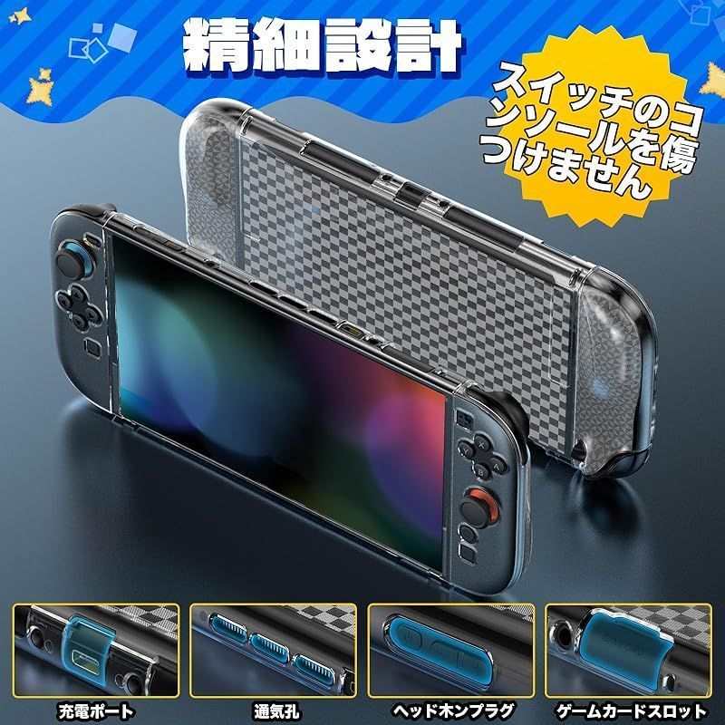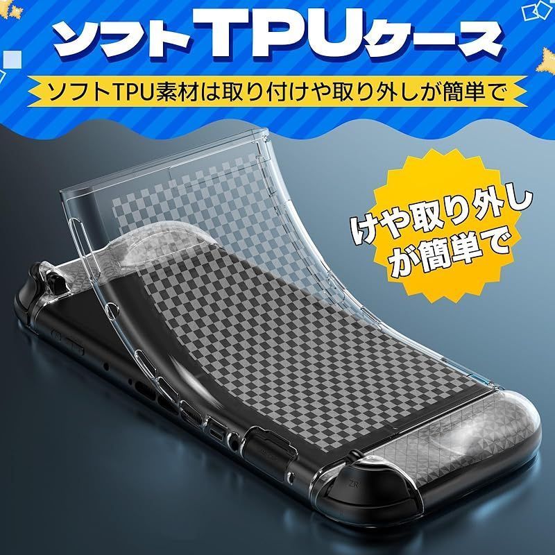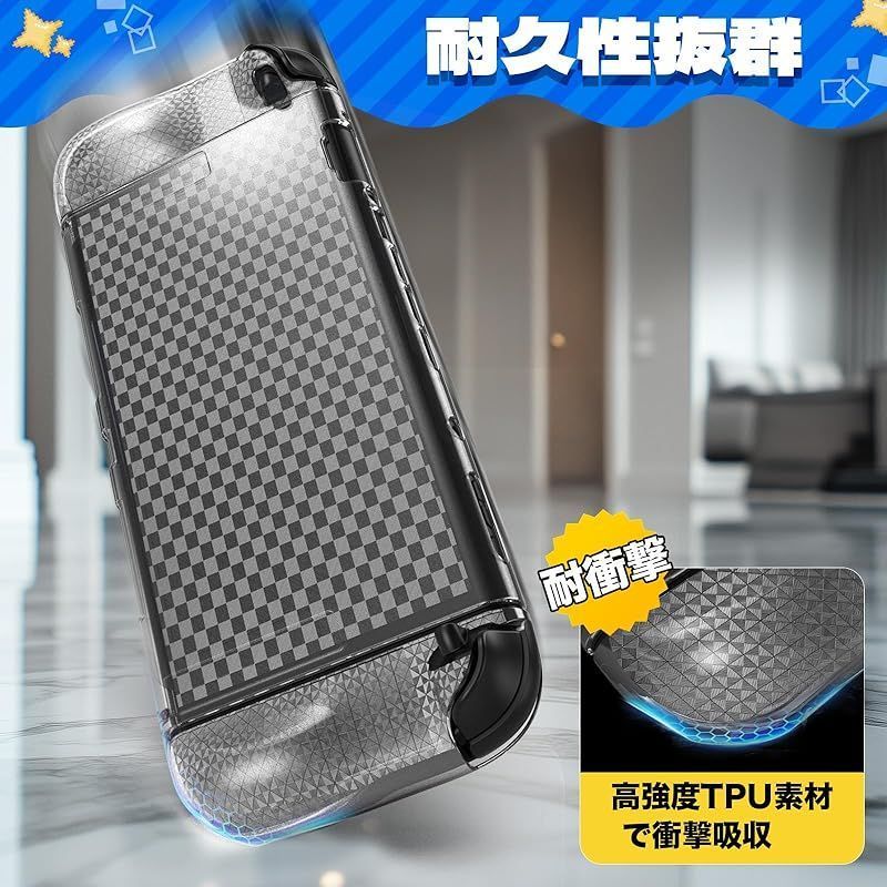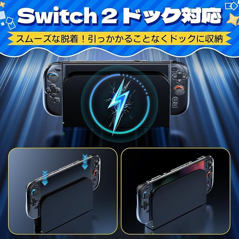 ??【装着したままドックOK!高品質TPU素材】 Switch 2 カバーの素材には、柔軟性と耐衝撃性に優れた高品質 TPU を採用しています。まるで鎧のように衝撃を吸収し、日常の摩擦や不意の落下から本体とジョイコンを確実に保護します。精密に設計された分体式デザインは、着脱が簡単なだけでなく、ケースを装着したまま純正ドックにスムーズに接続できます。充電や TV モードへの移行もストレスフリーで、快適なゲームライフを一切妨げません。