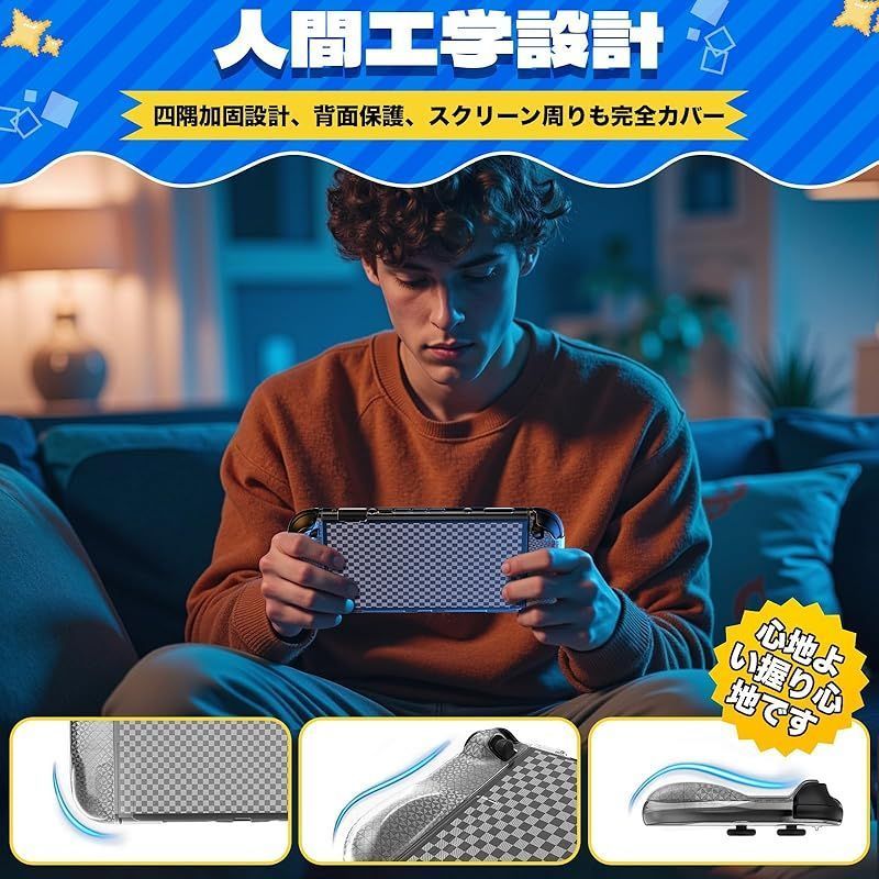??【長時間のプレイが劇的に変わる!人間工学設計】 「長時間プレイすると手が疲れる…」そんな悩みを解決するため、Switch 2 カバーには全く新しい人間工学に基づいたグリップ設計を採用しています。Joy-Con カバー背面に設けられた絶妙な膨らみが、驚くほど自然に手にフィットし、長時間のプレイでも疲れにくい抜群のホールド感を生み出します。付属の親指キャップと併用することで、グリップ力はさらに向上し、より正確で快適な操作が可能になります。