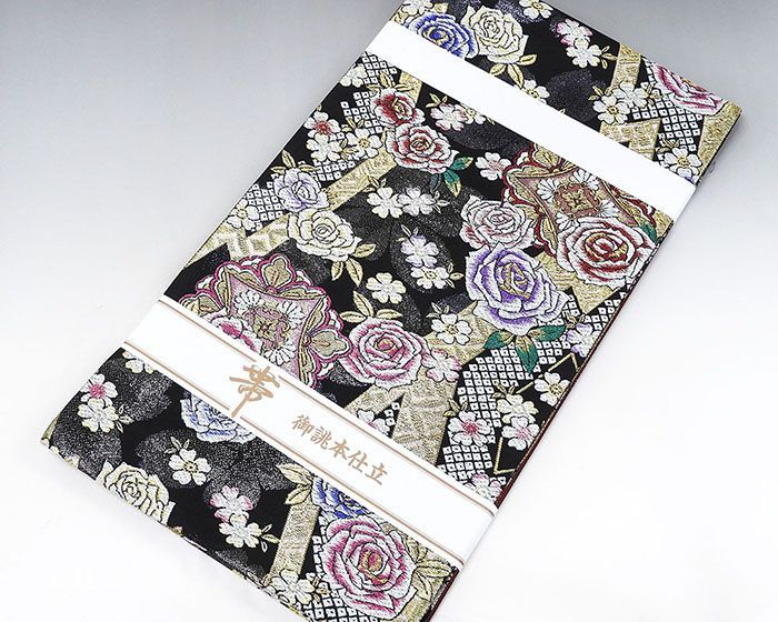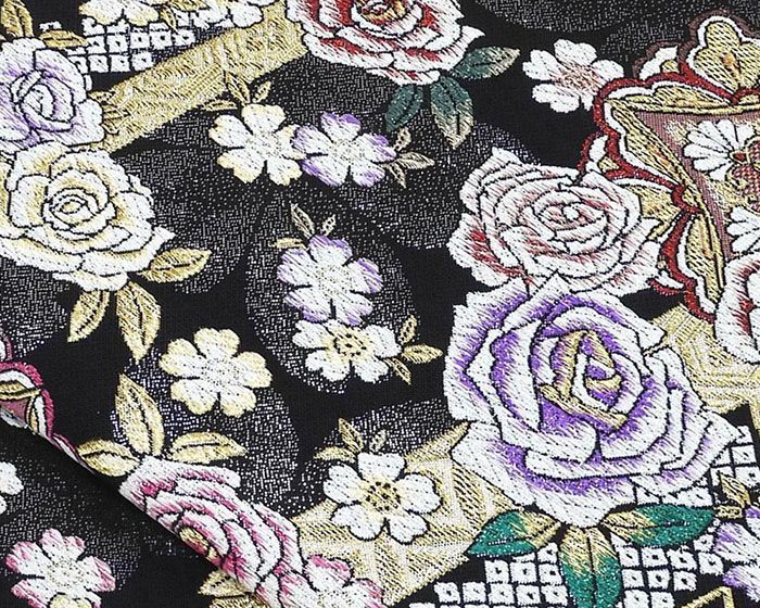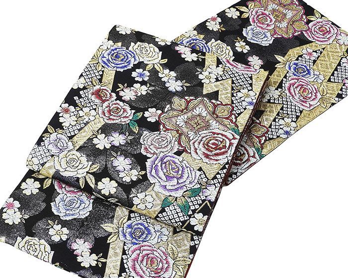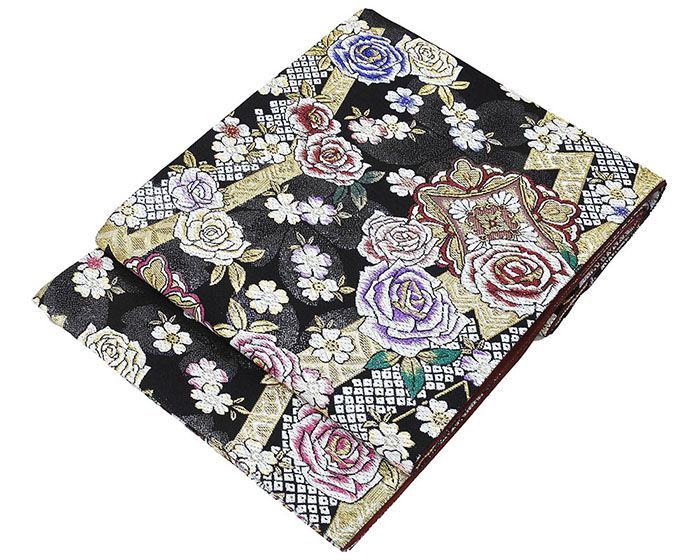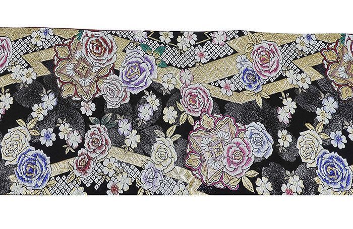 黒色地にローズレッドやパープル・オリエンタルブルーなどの多色のラメ箔と金銀糸で薔薇桜花菱模様が柄付けされています。