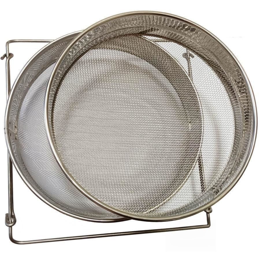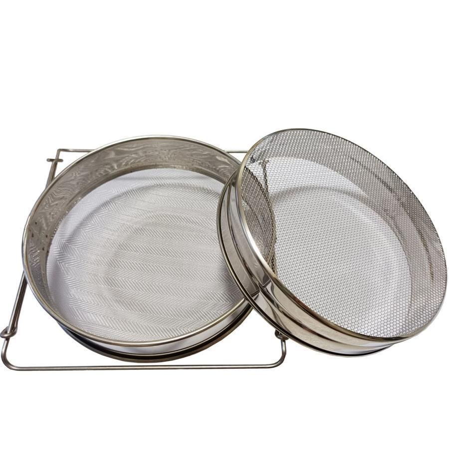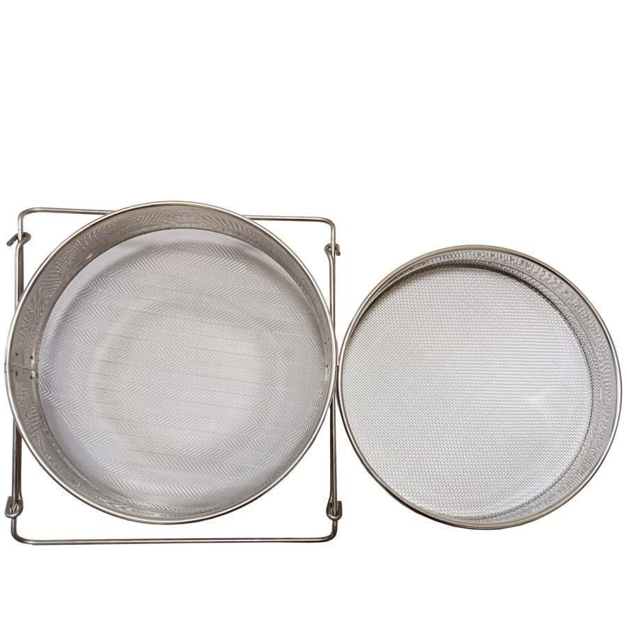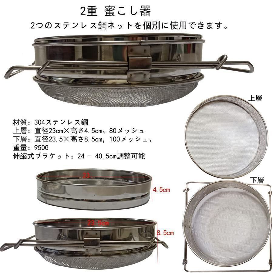 2重 蜜 こし器 :2重構造,上層ステンレス ブラシ:直径23cm×高さ4.5cm、80メッシュ、下層ステンレス ブラシ:直径23.5×高さ8.5cm,100メッシュ、重量:950G。