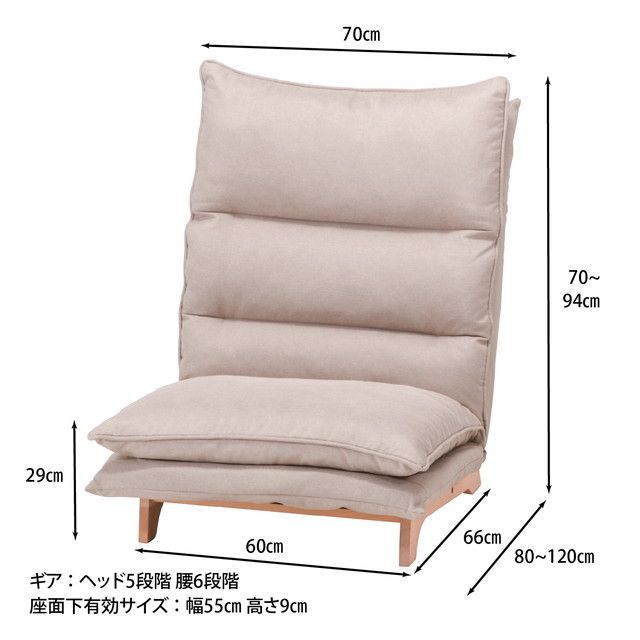 夏はべたつかず、冬はひんやりとしない、ファブリック素材を使用しています。シート高さ290mm/構造部材:金属(鋼)/張り材:ポリエステル/クッション材:ウレタンフォーム/構造部材(フレーム):天然木/スチールパイプ/腰部レバー式6段階ギア+ヘッド部5段階ギア(KOYO)