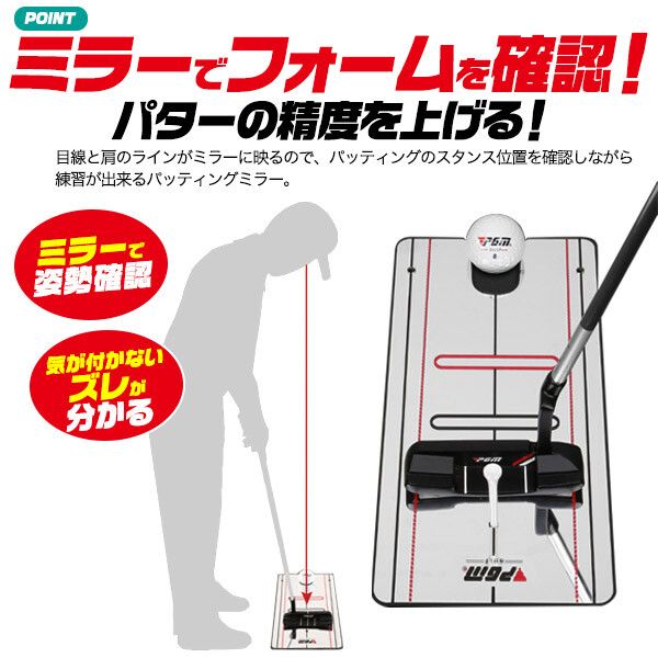 目線と肩のラインがミラーに映るので、パッティングのスタンス位置を確認しながら練習が出来るパッティングミラー。