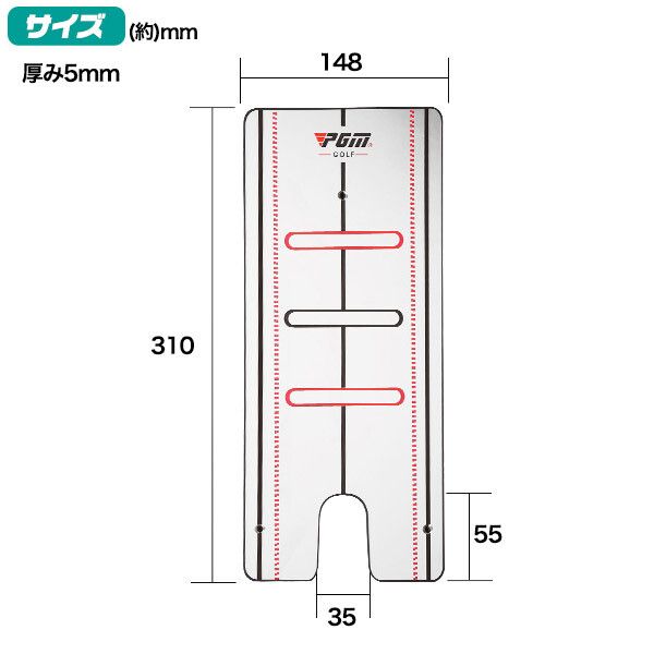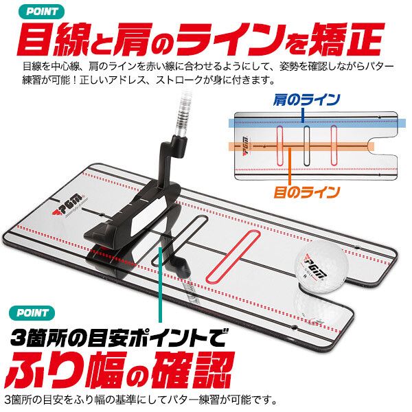 目線を中心線、肩のラインを赤い線に合わせるようにして、姿勢を確認しながらパター練習が可能!正しいアドレス、ストロークが身に付きます。