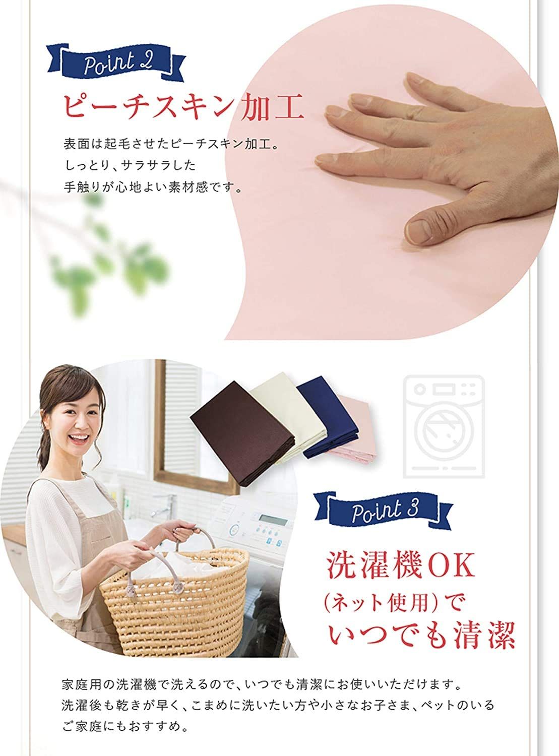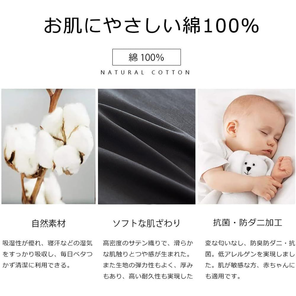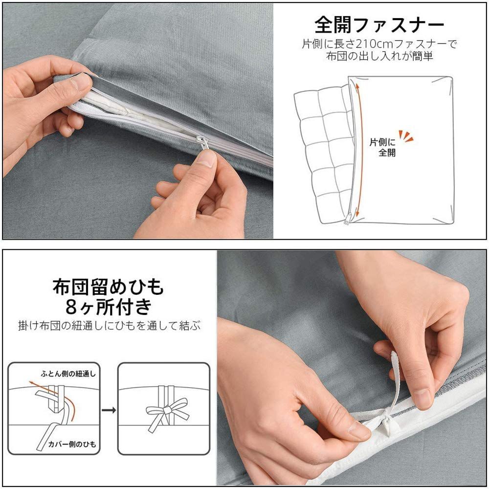 ?片側に210cm全開ファスナー使用 - ファスナーは端まで開くので、布団の出し入れがやすくなっています。?布団留めひも8ヶ所付き - 掛け布団の紐通しにカバーのひもを通して結びこどで、布団とカバーがずれにくいです。オールシーズンずっと心地よくお休みいただけるように使いやすさと品質にもこだわりました。「安全」:防臭、防ダニ、抗菌、ホルムアルデヒド無し。低アレルギー性の生地を使いますので、肌が敏感な方、赤ちゃんにも最適です。肌にあたる生地は、なめらかな肌触りのピーチスキン加工なので快適にお休みいただけます。