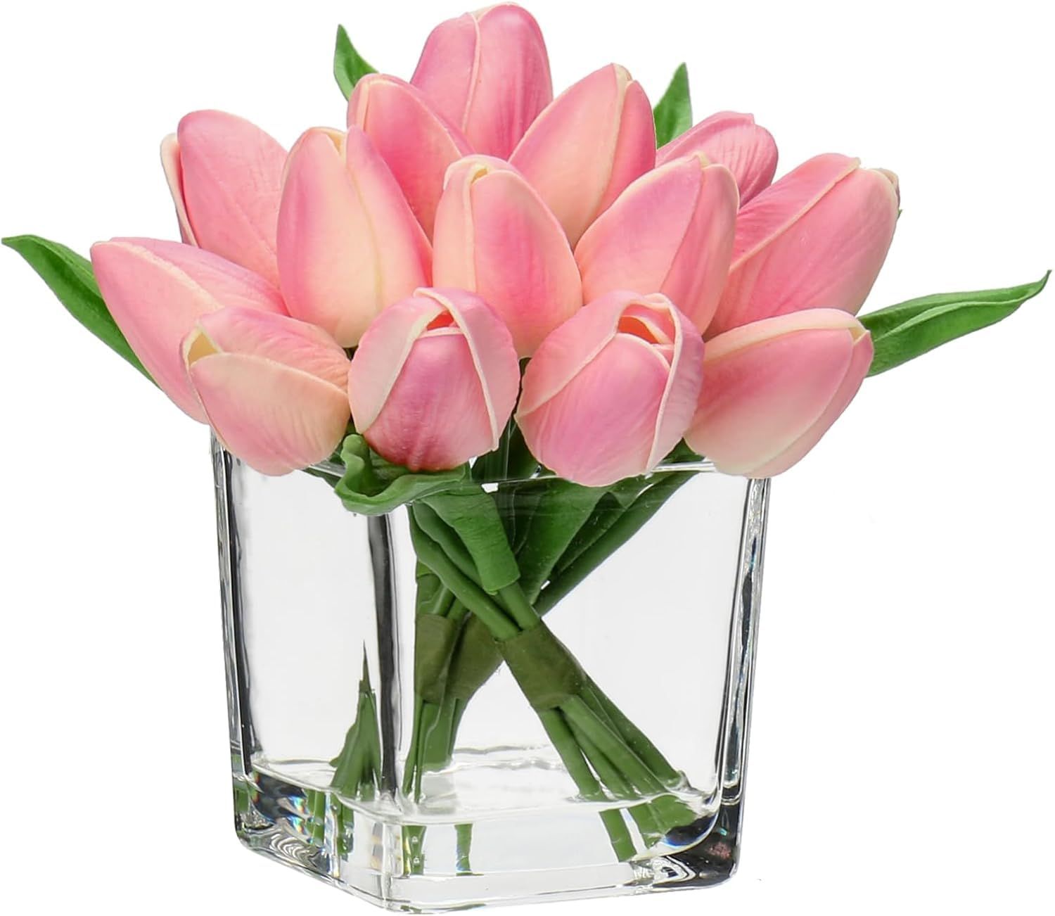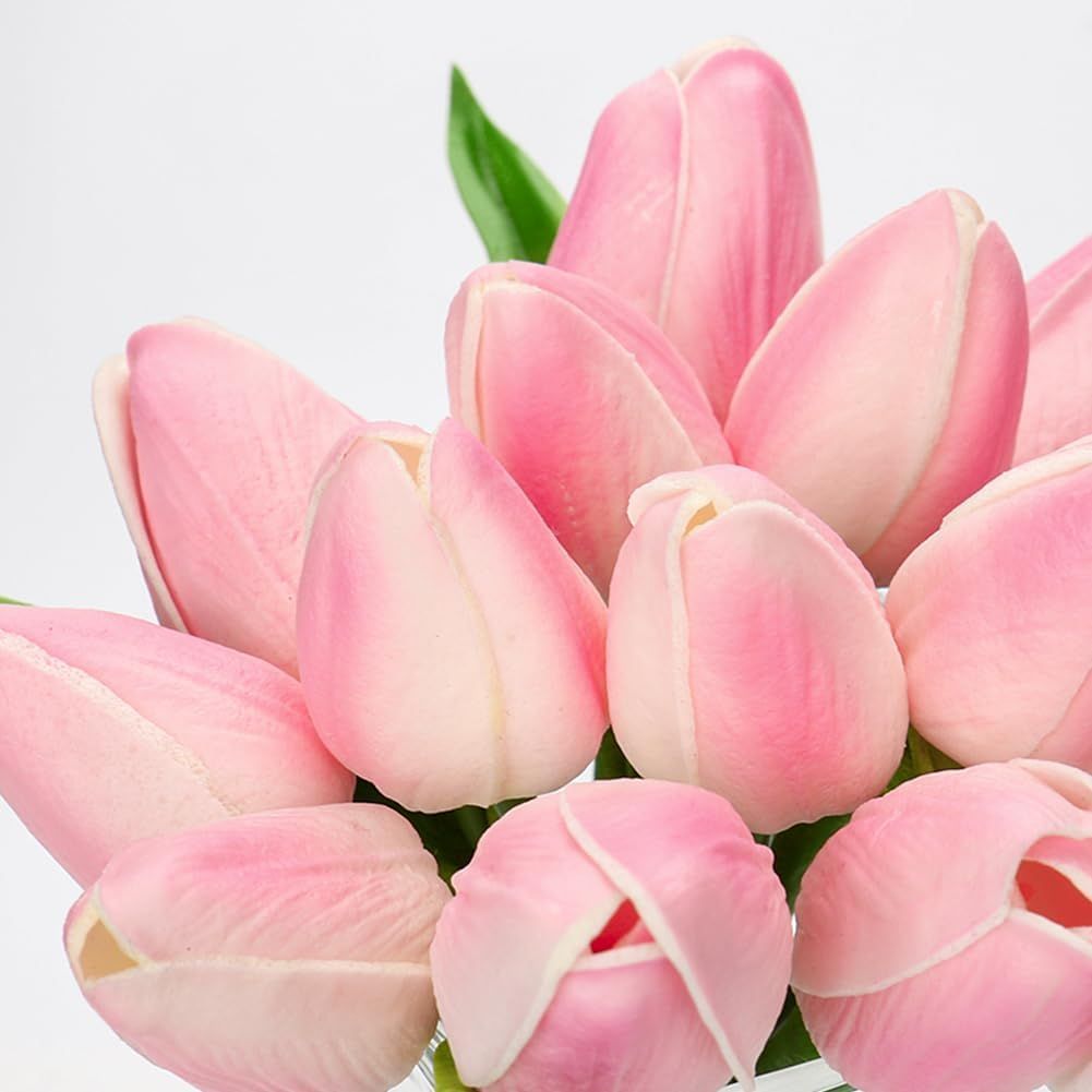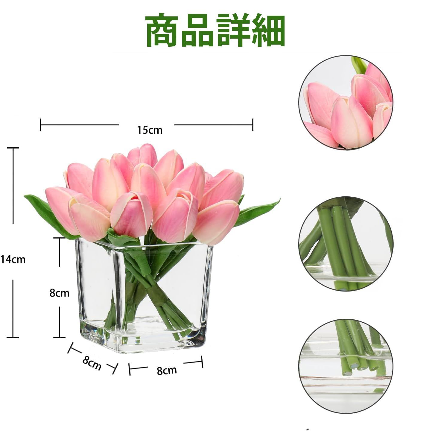 ??【本物そっくりの美しさ】高さ16cmのコンパクトなサイズながら、14本のチューリップがふんわりと広がり、ガラスの花瓶の口元を優雅に彩ります。高品質PU材質を採用しており、花びらの色合いや質感にこだわり、まるで摘みたてのようなフレッシュな印象を演出します。
