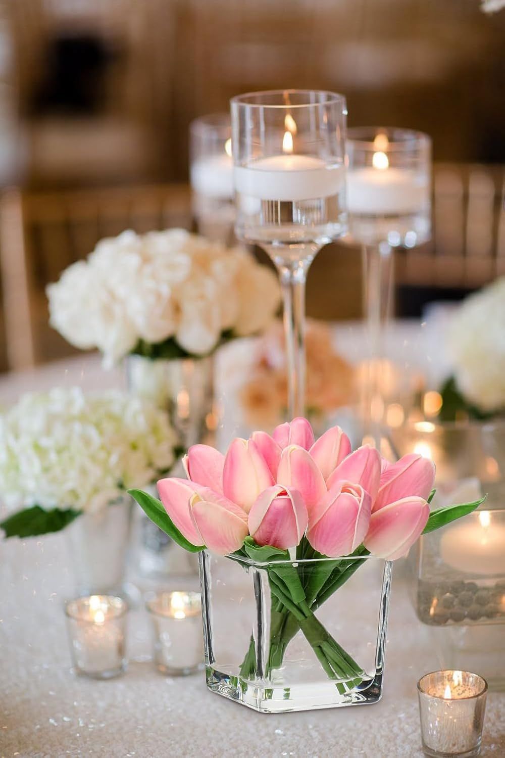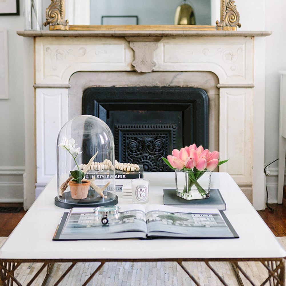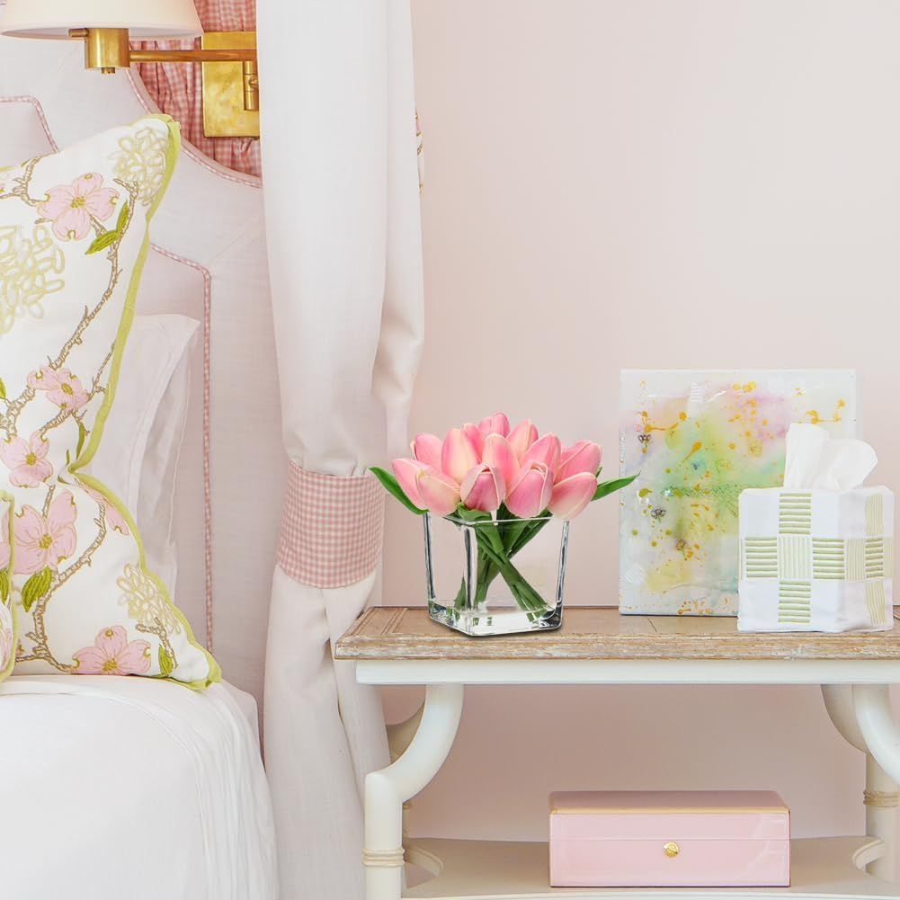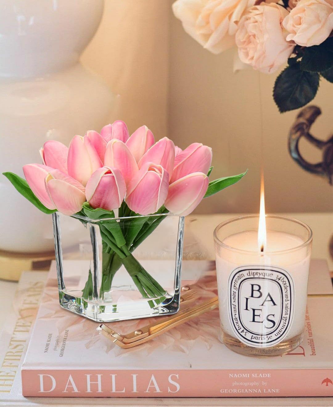 ??【本物そっくりの美しさ】高さ16cmのコンパクトなサイズながら、14本のチューリップがふんわりと広がり、ガラスの花瓶の口元を優雅に彩ります。高品質PU材質を採用しており、花びらの色合いや質感にこだわり、まるで摘みたてのようなフレッシュな印象を演出します。