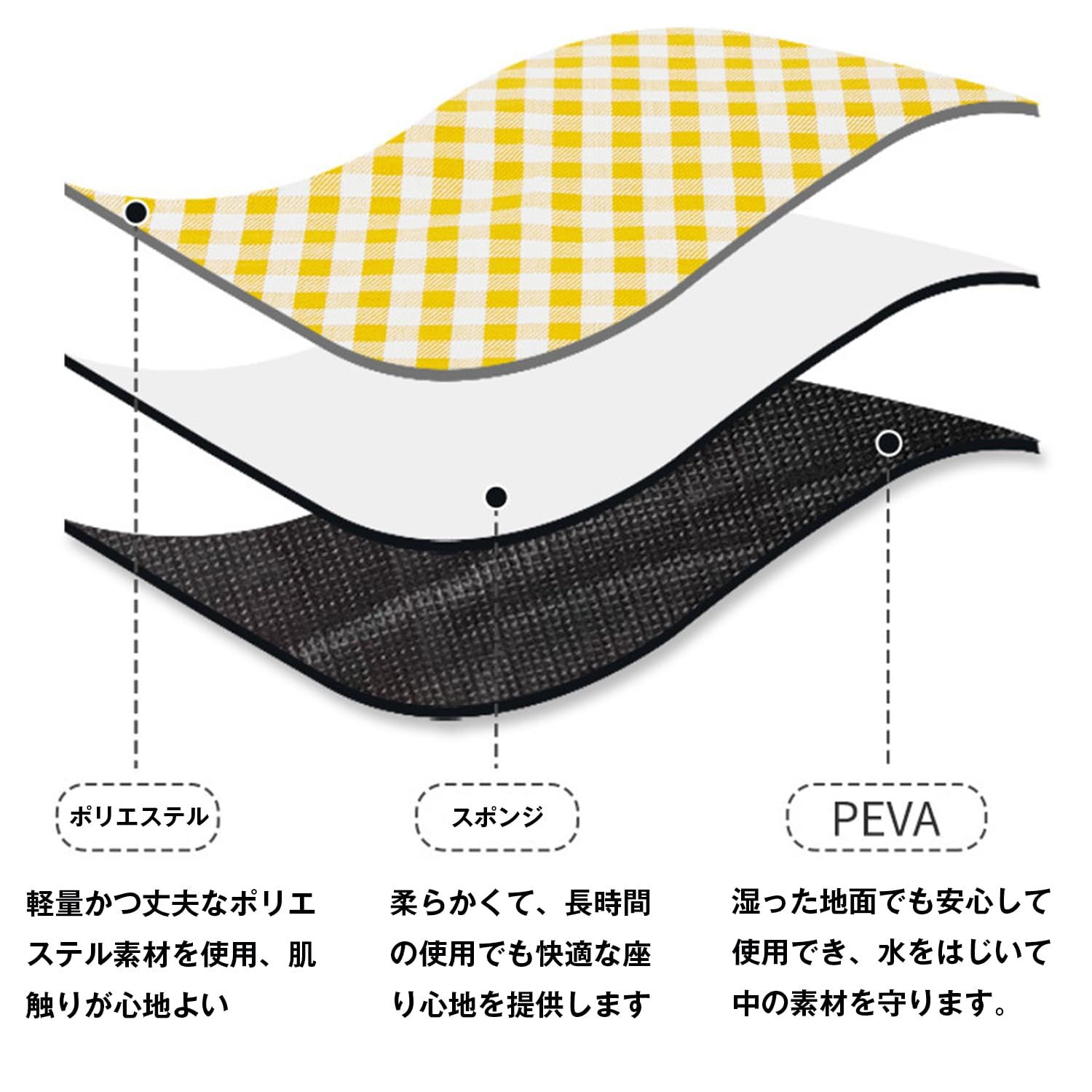 【防水素材 3層構造】表面は軽量かつ丈夫なポリエステル素材を使用、肌触りが心地よく、中身はスポンジが入っていて、長時間の使用でも快適な座り心地を提供します。裏面はPEVA素材で湿った地面でも安心して使用できます。雨天でも、水をはじいて中の素材を守ります。