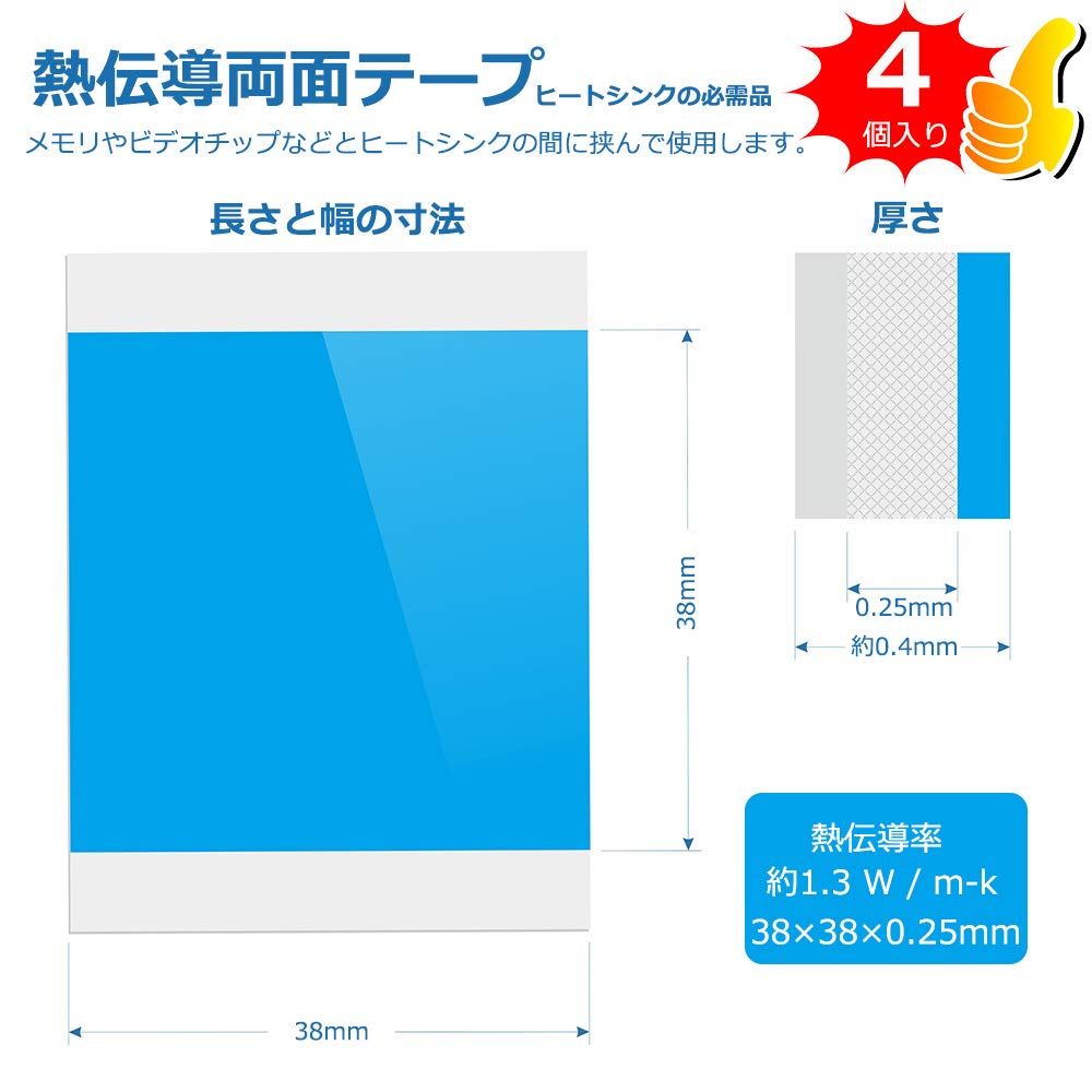 熱暴走対策、4pcs両面粘着導熱接着シート付き。導熱接着シートの熱伝導率: 1.32 W / m-k。寸法: 38×38×0.25mm