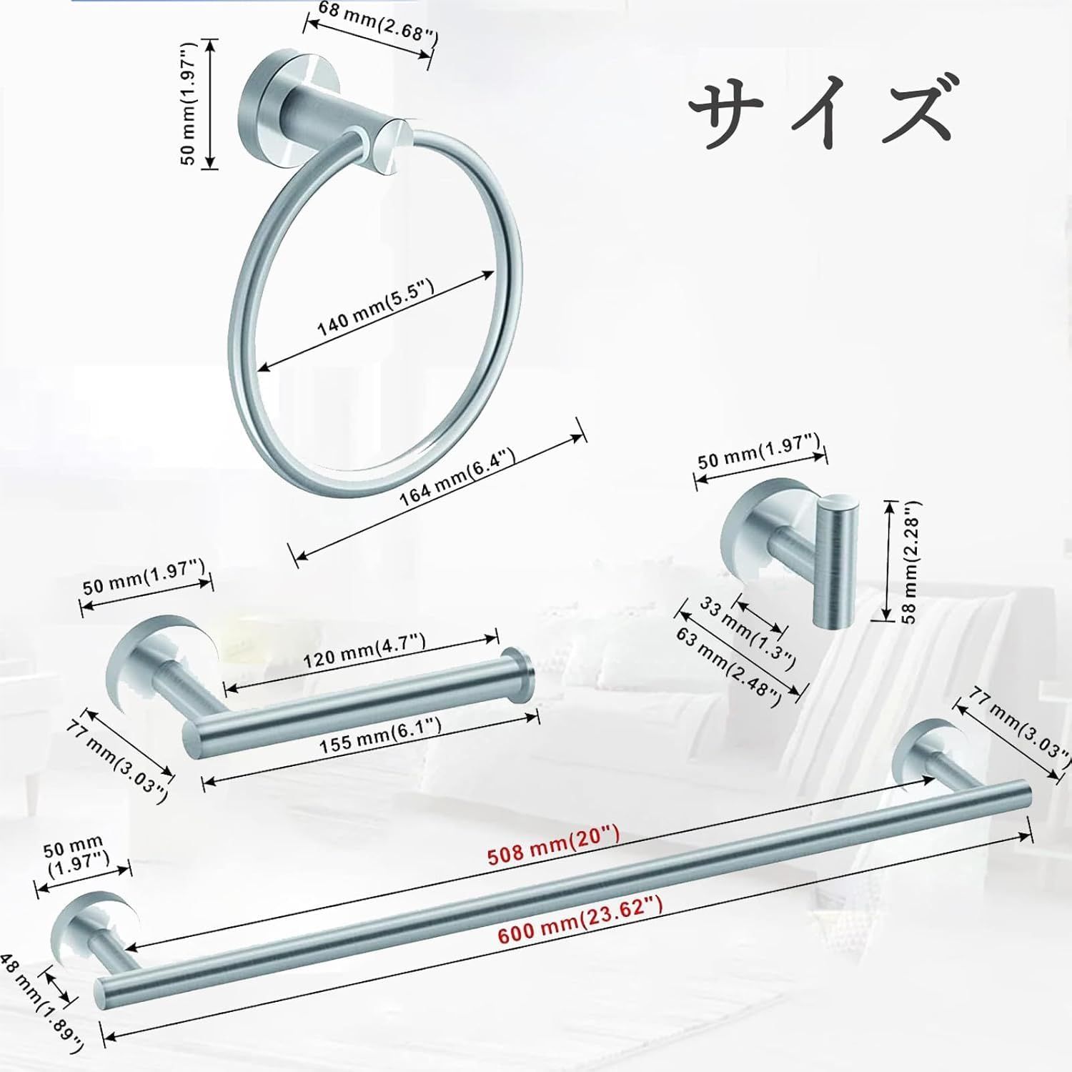 5点セット おしゃれ ステンレス トイレットペーパーホルダー タオルバー 壁掛けフック 壁掛け タオル掛け タオルフック ビス止め キッチン 洗面所 トイレ 浴室 バスルームアクセサリー