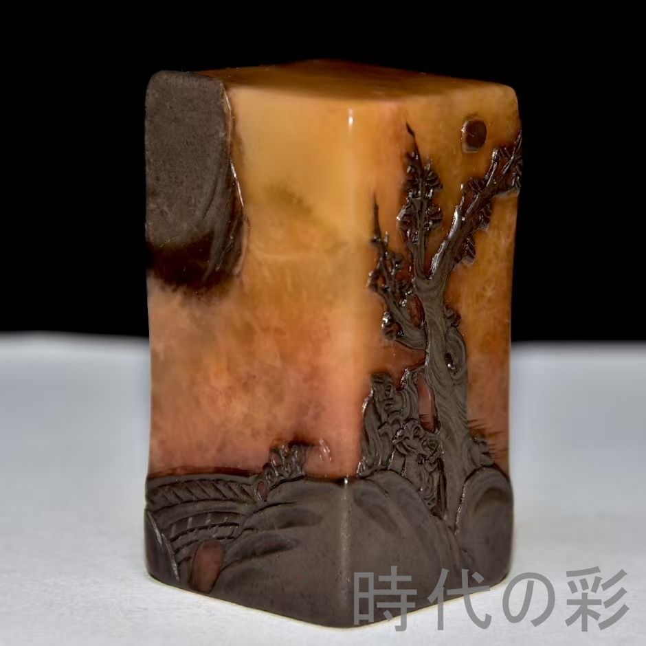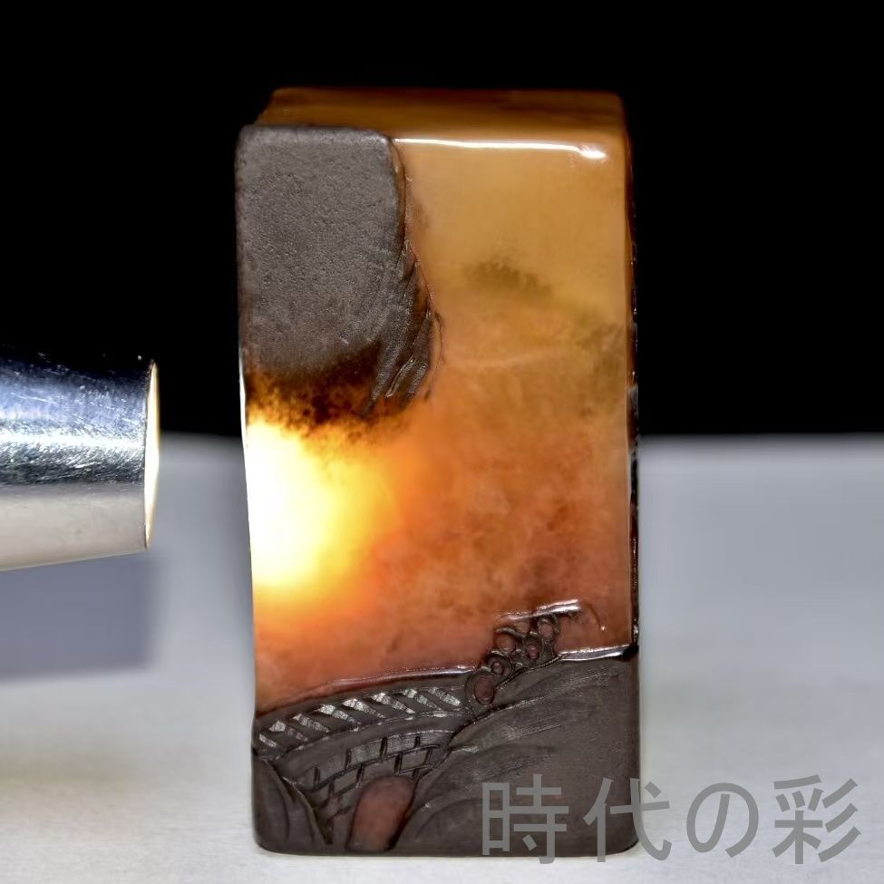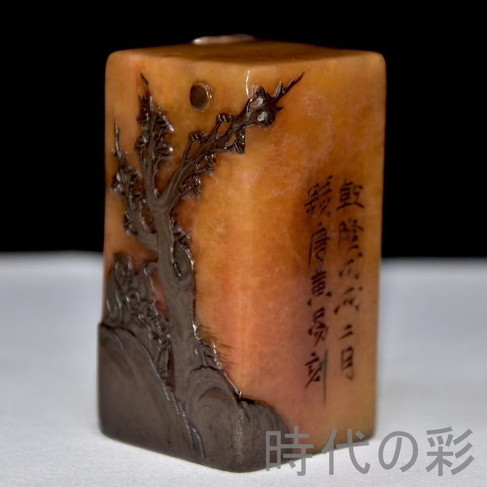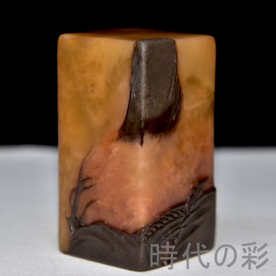 旧蔵烏鴉皮田黄石印章。血絲紋と?卜絲紋が鮮明。石質は通透堅質で彫刻は精巧。篆刻家「黄易」作と伝わり収蔵価値が非常に高さ:い。