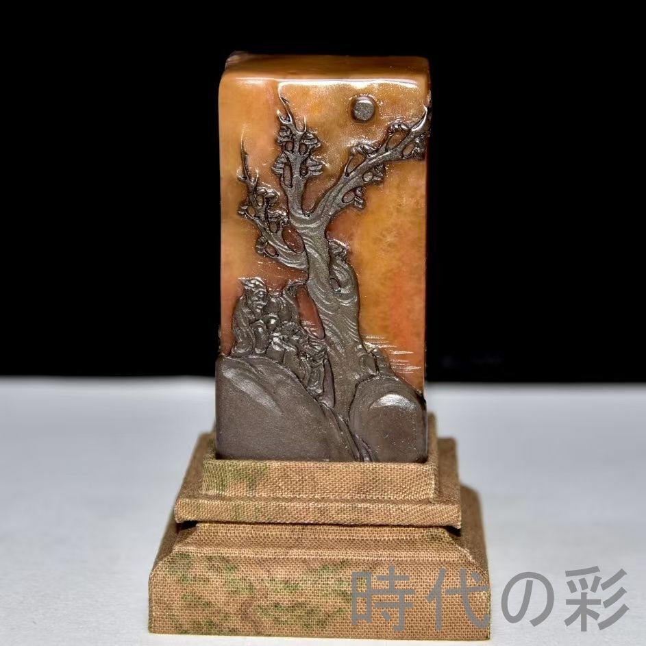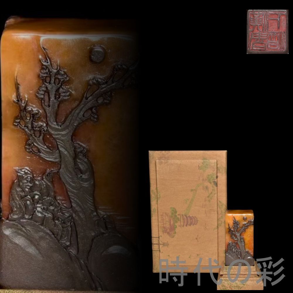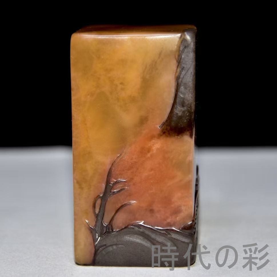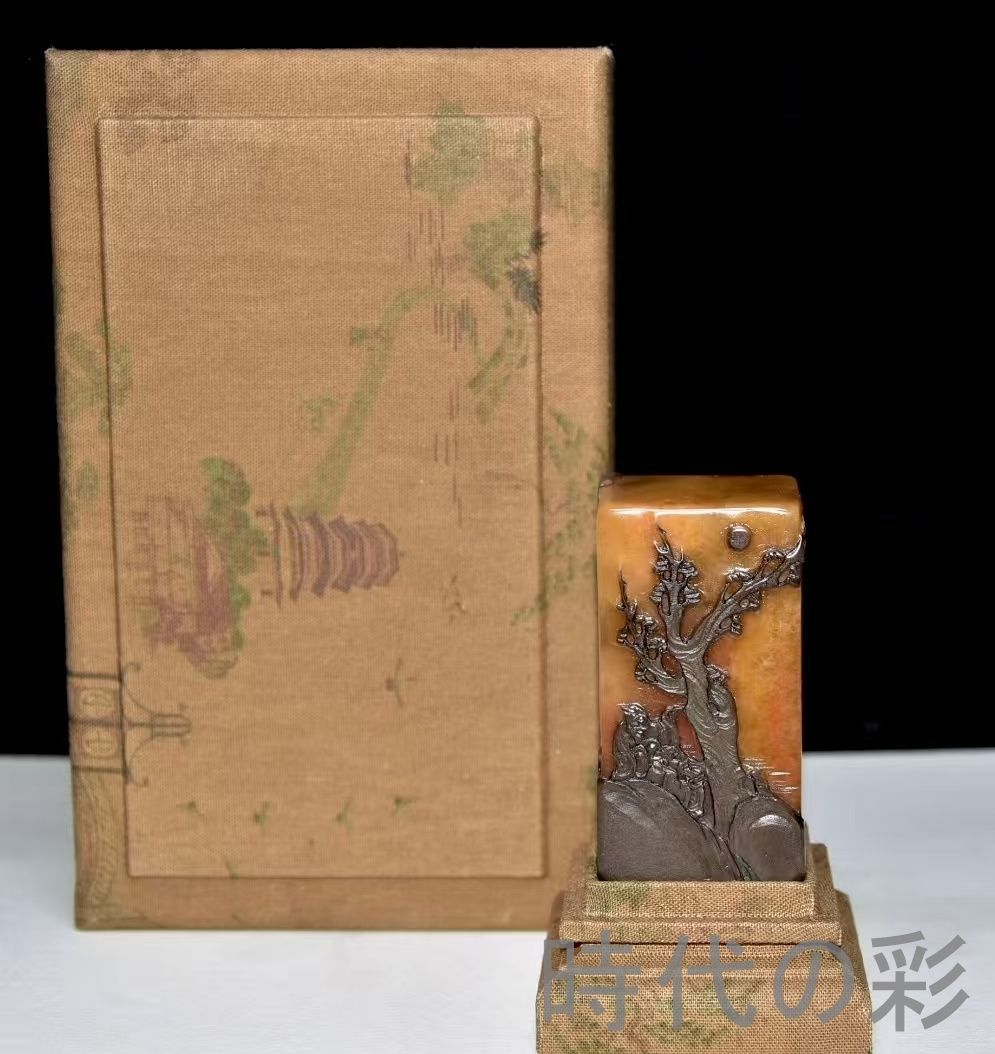 旧蔵烏鴉皮田黄石印章。血絲紋と?卜絲紋が鮮明。石質は通透堅質で彫刻は精巧。篆刻家「黄易」作と伝わり収蔵価値が非常に高さ:い。